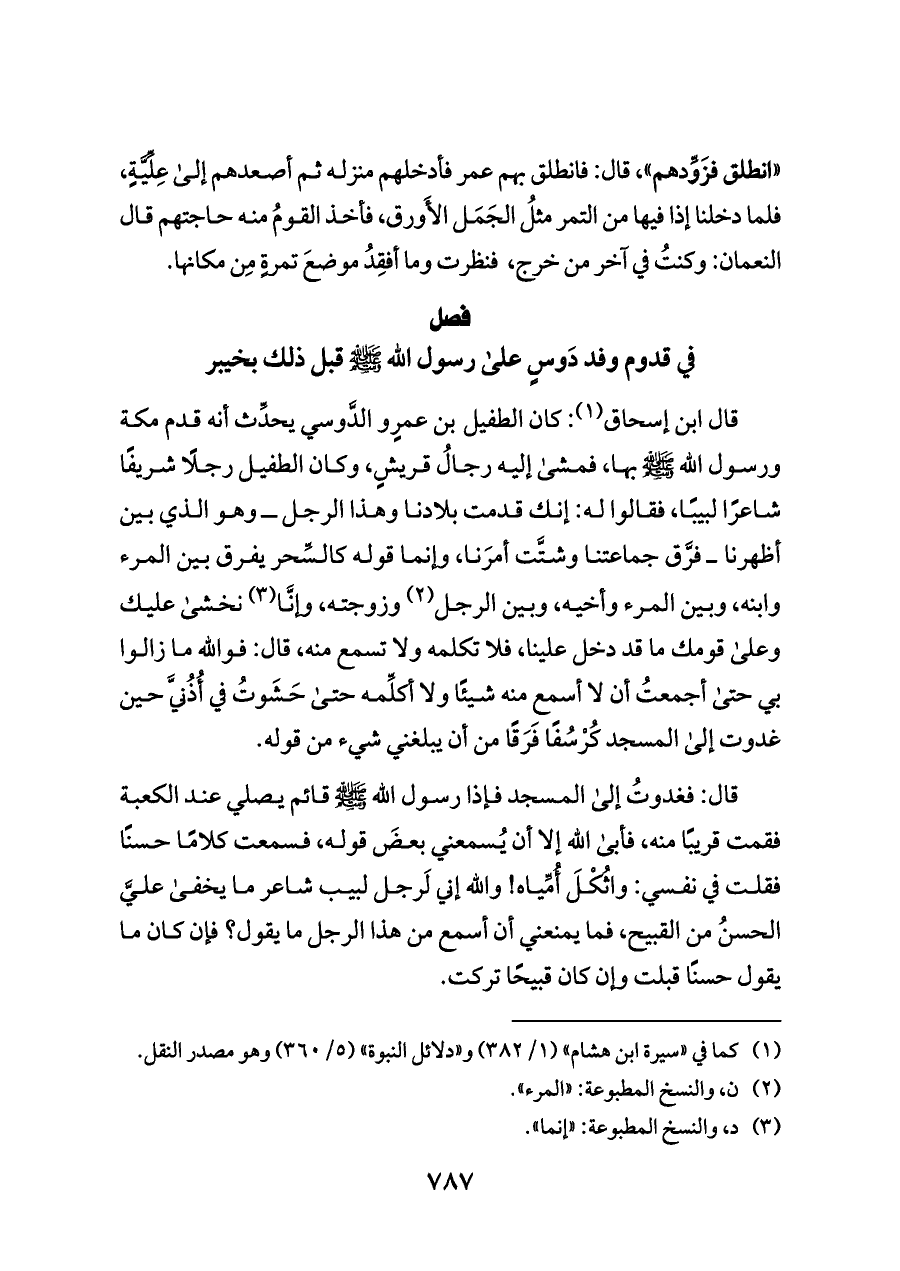 قال ابن إسحاق (¬١): كان الطفيل بن عمرٍو الدَّوسي يحدِّث أنه قدم مكة ورسول الله - صلى الله عليه وسلم - بها، فمشى إليه رجالُ قريشٍ، وكان الطفيل رجلًا شريفًا شاعرًا لبيبًا، فقالوا له: إنك قدمت بلادنا وهذا الرجل ــ وهو الذي بين أظهرنا ــ فرَّق جماعتنا وشتَّت أمرَنا، وإنما قوله كالسِّحر يفرق بين المرء وابنه، وبين المرء وأخيه، وبين الرجل (¬٢) وزوجته، وإنَّا (¬٣) نخشى عليك وعلى قومك ما قد دخل علينا، فلا تكلمه ولا تسمع منه، قال: فوالله ما زالوا بي حتى أجمعتُ أن لا أسمع منه شيئًا ولا أكلِّمه حتى حَشَوتُ في أُذُنيَّ حين غدوت إلى المسجد كُرْسُفًا فَرَقًا من أن يبلغني شيء من قوله.
