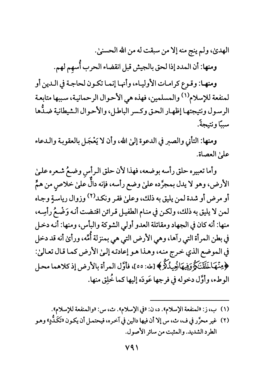 ومنها: وقوع كرامات الأولياء، وأنها إنما تكون لحاجة في الدين أو لمنفعة للإسلام (¬١) والمسلمين، فهذه هي الأحوال الرحمانية، سببها متابعة الرسول ونتيجتها إظهار الحق وكسر الباطل، والأحوال الشيطانية ضدُّها سببًا ونتيجةً.