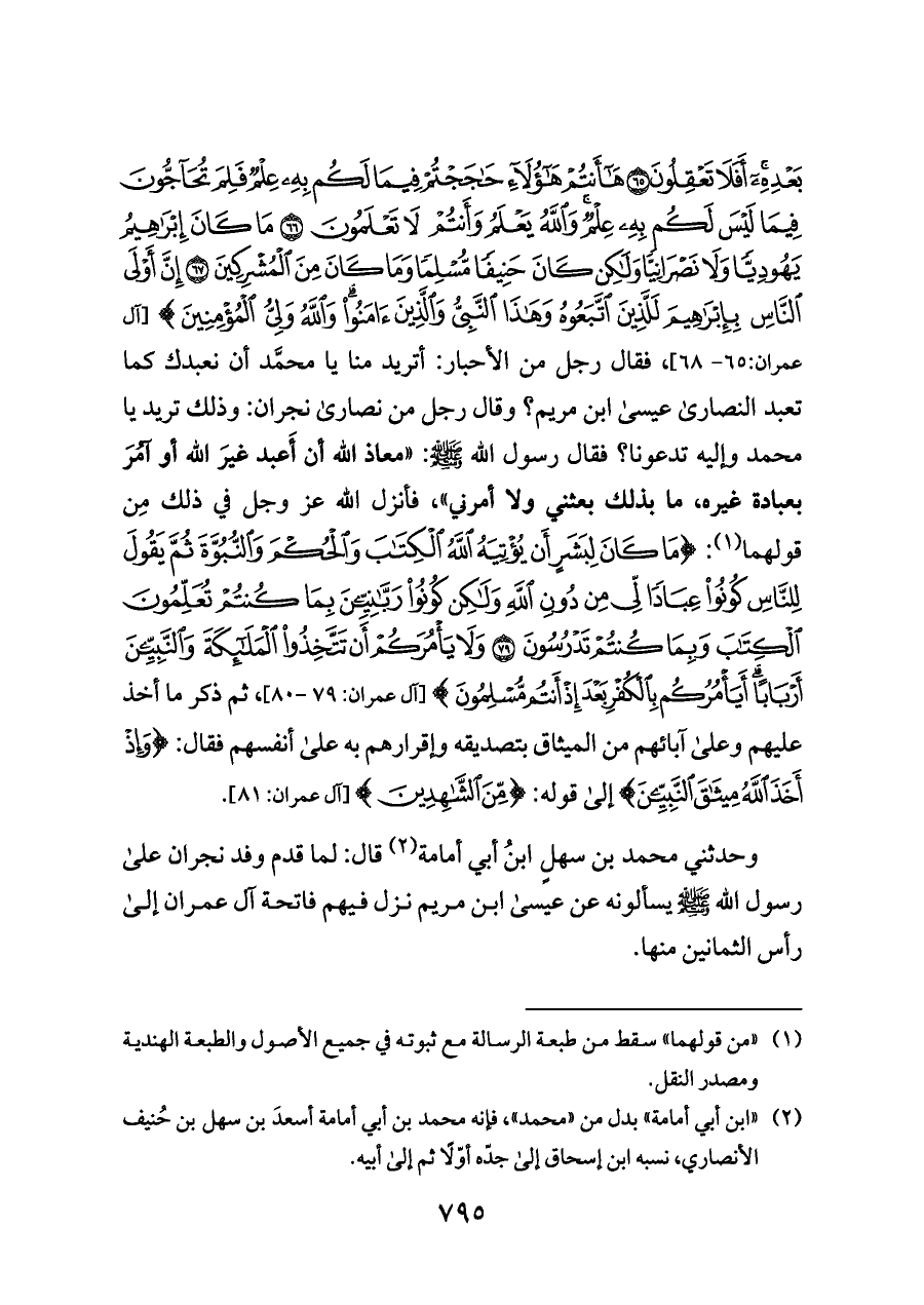 بَعْدِهِ أَفَلَا تَعْقِلُونَ (٦٥) هَاأَنْتُمْ هَؤُلَاءِ حَاجَجْتُمْ فِيمَا لَكُمْ بِهِ عِلْمٌ فَلِمَ تُحَاجُّونَ فِيمَا لَيْسَ لَكُمْ بِهِ عِلْمٌ وَاللَّهُ يَعْلَمُ وَأَنْتُمْ لَا تَعْلَمُونَ (٦٦) مَا كَانَ إِبْرَاهِيمُ يَهُودِيًّا وَلَا نَصْرَانِيًّا وَلَكِنْ كَانَ حَنِيفًا مُسْلِمًا وَمَا كَانَ مِنَ الْمُشْرِكِينَ (٦٧) إِنَّ أَوْلَى النَّاسِ بِإِبْرَاهِيمَ لَلَّذِينَ اتَّبَعُوهُ وَهَذَا النَّبِيُّ وَالَّذِينَ آمَنُوا وَاللَّهُ وَلِيُّ الْمُؤْمِنِينَ} [آل عمران:٦٥ - ٦٨]، فقال رجل من الأحبار: أتريد منا يا محمَّد أن نعبدك كما تعبد النصارى عيسى ابن مريم؟ وقال رجل من نصارى نجران: وذلك تريد يا محمد وإليه تدعونا؟ فقال رسول الله - صلى الله عليه وسلم -: «معاذ الله أن أَعبد غيرَ الله أو آمُرَ بعبادة غيره، ما بذلك بعثني ولا أمرني»، فأنزل الله عز وجل في ذلك مِن قولهما (¬١):