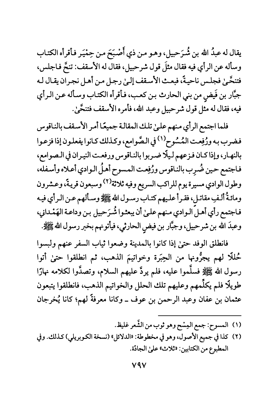 فلما اجتمع الرأي منهم على تلك المقالة جميعًا أمر الأسقف بالناقوس فضرب به ورُفِعت المُسُوح (¬١) في الصَّوامع، وكذلك كانوا يفعلون إذا فزعوا بالنهار، وإذا كان فزعهم ليلًا ضربوا بالناقوس ورفعت النيران في الصوامع، فاجتمع حين ضُرِب بالناقوس ورُفِعت المسوح أهلُ الوادي أعلاه وأسفله، وطول الوادي مسيرة يوم للراكب السريع وفيه ثلاثة (¬٢) وسبعون قريةً، وعشرون ومائةُ ألفِ مقاتلٍ، فقرأ عليهم كتاب رسول الله - صلى الله عليه وسلم - وسألهم عن الرأي فيه فاجتمع رأي أهل الوادي منهم على أن يبعثوا شُرَحبيل بن وداعة الهَمْداني، وعبدَ الله بن شرحبيل، وجبَّار بن فيضٍ الحارثي، فيأتونهم بخبر رسول الله - صلى الله عليه وسلم -.