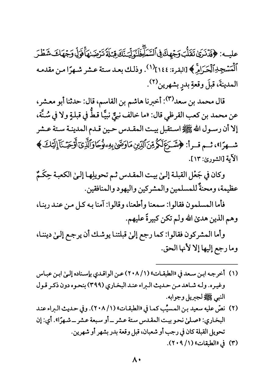 (¬٢) نصّ عليه سعيد بن المسيِّب كما في «الطبقات» (١/ ٢٠٨). وفي حديث البراء عند البخاري: «صلى نحو بيت المقدس ستة عشر ــ أو سبعة عشر ــ شهرًا». أي: إن تحويل القبلة كان في رجب أو شعبان، قبل وقعة بدر بشهر أو شهرين.