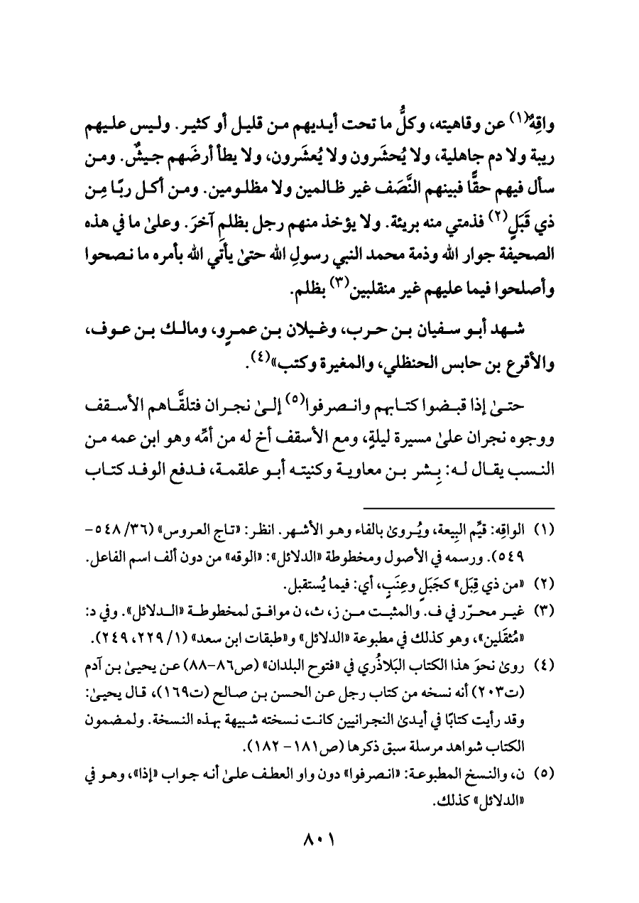 (¬٤) روى نحوَ هذا الكتاب البَلاذُري في «فتوح البلدان» (ص ٨٦ - ٨٨) عن يحيى بن آدم (ت ٢٠٣) أنه نسخه من كتاب رجل عن الحسن بن صالح (ت ١٦٩)، قال يحيى: وقد رأيت كتابًا في أيدى النجرانيين كانت نسخته شبيهة بهذه النسخة. ولمضمون الكتاب شواهد مرسلة سبق ذكرها (ص ١٨١ - ١٨٢).