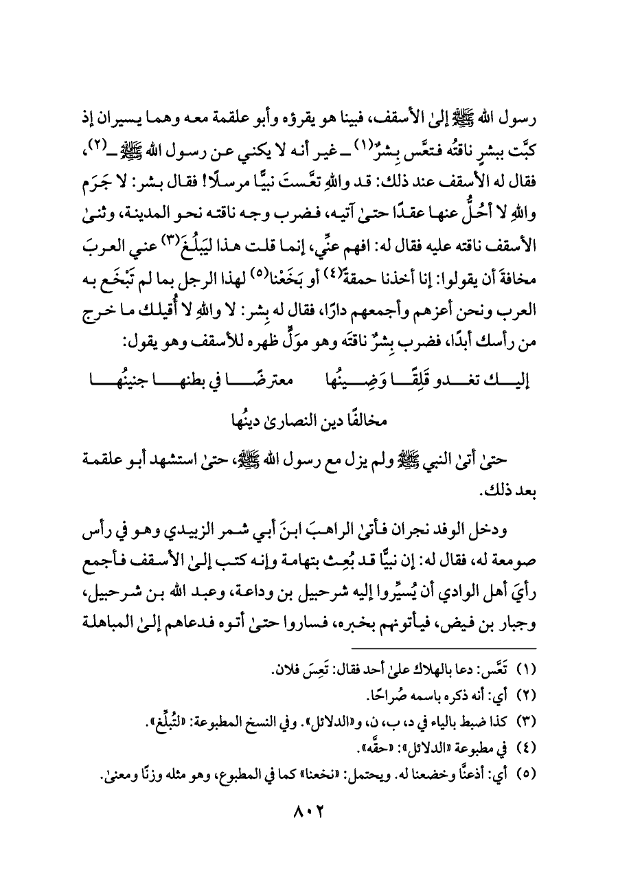 رسول الله - صلى الله عليه وسلم - إلى الأسقف، فبينا هو يقرؤه وأبو علقمة معه وهما يسيران إذ كبَّت ببشرٍ ناقتُه فتعَّس بِشرٌ (¬١) ــ غير أنه لا يكني عن رسول الله - صلى الله عليه وسلم - ــ (¬٢)، فقال له الأسقف عند ذلك: قد واللهِ تعَّستَ نبيًّا مرسلًا! فقال بشر: لا جَرَم واللهِ لا أحُلُّ عنها عقدًا حتى آتيه، فضرب وجه ناقته نحو المدينة، وثنى الأسقف ناقته عليه فقال له: افهم عنِّي، إنما قلت هذا ليَبلُغَ (¬٣) عني العربَ مخافةَ أن يقولوا: إنا أخذنا حمقةً (¬٤) أو بَخَعْنا (¬٥) لهذا الرجل بما لم تَبْخَع به العرب ونحن أعزهم وأجمعهم دارًا، فقال له بِشر: لا واللهِ لا أُقيلك ما خرج من رأسك أبدًا، فضرب بِشرٌ ناقتَه وهو موَلٍّ ظهره للأسقف وهو يقول: