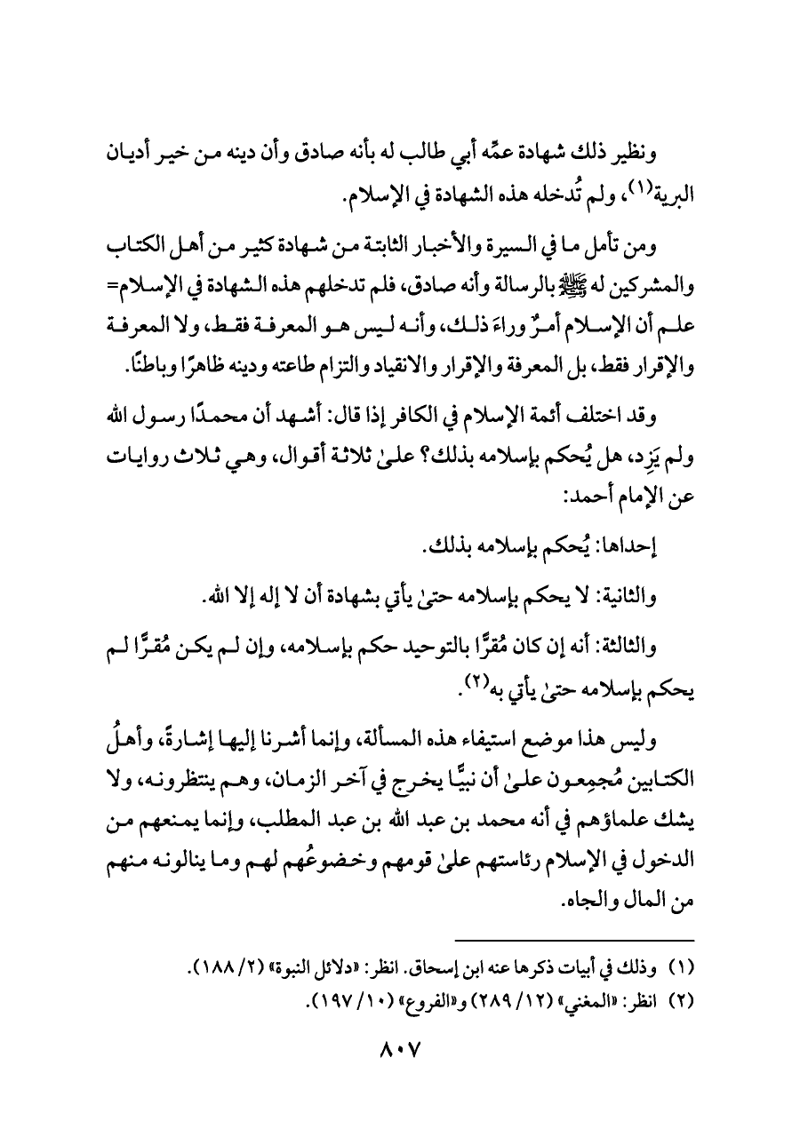 ونظير ذلك شهادة عمِّه أبي طالب له بأنه صادق وأن دينه من خير أديان البرية (¬١)، ولم تُدخله هذه الشهادة في الإسلام.