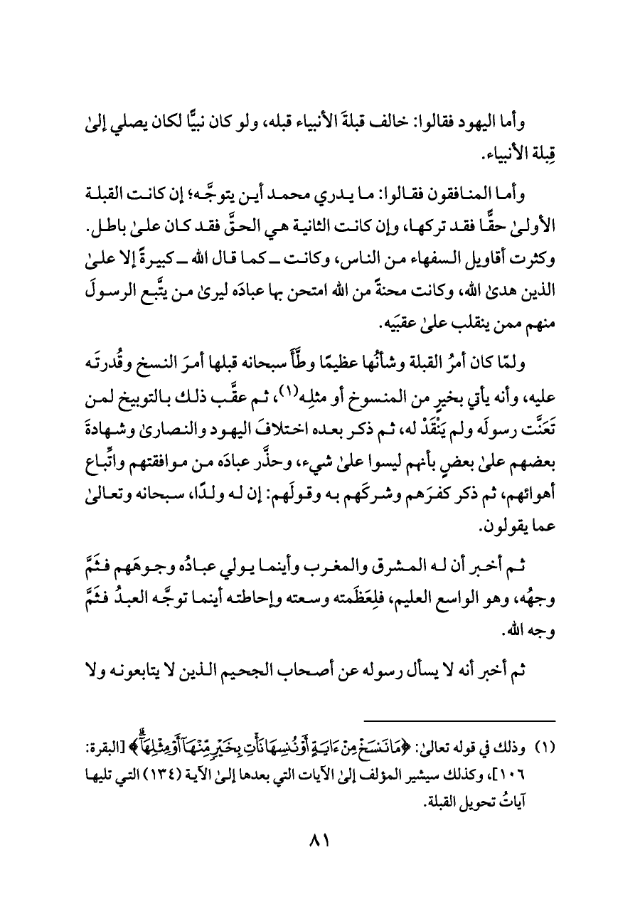 (¬١) وذلك في قوله تعالى: {مَا نَنْسَخْ مِنْ آيَةٍ أَوْ نُنْسِهَا نَأْتِ بِخَيْرٍ مِنْهَا أَوْ مِثْلِهَا} [البقرة: ١٠٦]، وكذلك سيشير المؤلف إلى الآيات التي بعدها إلى الآية (١٣٤) التي تليها آياتُ تحويل القبلة.