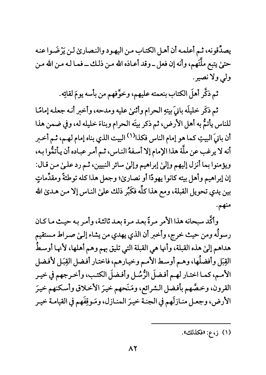ثم ذكَر خليلَه بانيَ بيتهِ الحرام وأثنى عليه ومدحه، وأخبر أنه جعله إمامًا للناس يأتمُّ به أهل الأرض، ثم ذكر بيتَه الحرام وبناءَ خليله له، وفي ضمن هذا أن بانيَ البيتِ كما هو إمام الناس فكذا (¬١) البيت الذي بناه إمام لهم، ثم أخبر أنه لا يرغب عن ملَّة هذا الإمام إلا أسفهُ الناس، ثم أمر عباده أن يأتمُّوا به، ويؤمنوا بما أنزل إليهم وإلى إبراهيم وإلى سائر النبيين، ثم رد على من قال: إن إبراهيم وأهل بيته كانوا يهودًا أو نصارى؛ وجعل هذا كله توطئةً ومقدِّماتٍ بين يدي تحويل القبلة، ومع هذا كلِّه فكَبُر ذلك على الناس إلا من هدى الله منهم.