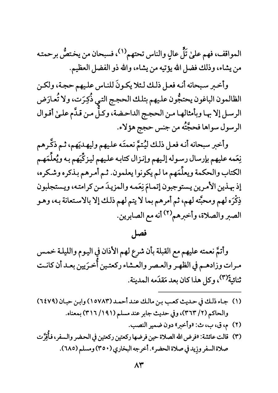 وأتمَّ نعمته عليهم مع القبلة بأن شرع لهم الأذان في اليوم والليلة خمس مرات وزادهم في الظهر والعصر والعشاء ركعتين أُخرَيين بعد أن كانت ثنائيةً (¬٣)، وكل هذا كان بعد مَقدَمه المدينة.