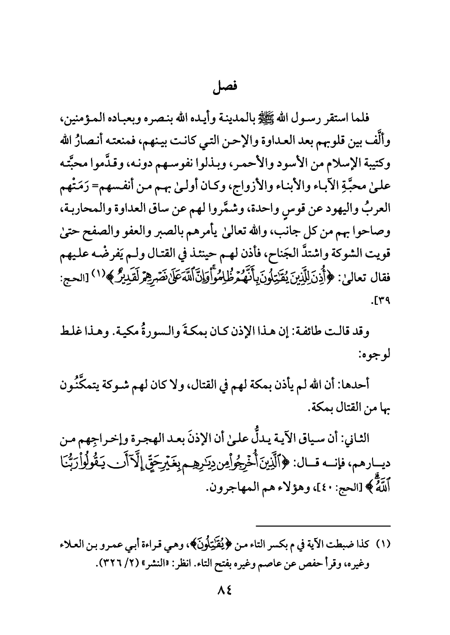 فلما استقر رسول الله - صلى الله عليه وسلم - بالمدينة وأيده الله بنصره وبعباده المؤمنين، وألَّف بين قلوبهم بعد العداوة والإحن التي كانت بينهم، فمنعته أنصارُ الله وكتيبة الإسلام من الأسود والأحمر، وبذلوا نفوسهم دونه، وقدَّموا محبَّته على محبَّةِ الآباء والأبناء والأزواج، وكان أولى بهم من أنفسهم= رَمَتْهم العربُ واليهود عن قوسٍ واحدة، وشمَّروا لهم عن ساق العداوة والمحاربة، وصاحوا بهم من كل جانب، والله تعالى يأمرهم بالصبر والعفو والصفح حتى قويت الشوكة واشتدَّ الجَناح، فأذن لهم حينئذ في القتال ولم يَفرضْه عليهم فقال تعالى: {أُذِنَ لِلَّذِينَ يُقَاتِلُونَ بِأَنَّهُمْ ظُلِمُوا وَإِنَّ اللَّهَ عَلَى نَصْرِهِمْ لَقَدِيرٌ} (¬١) [الحج: ٣٩].