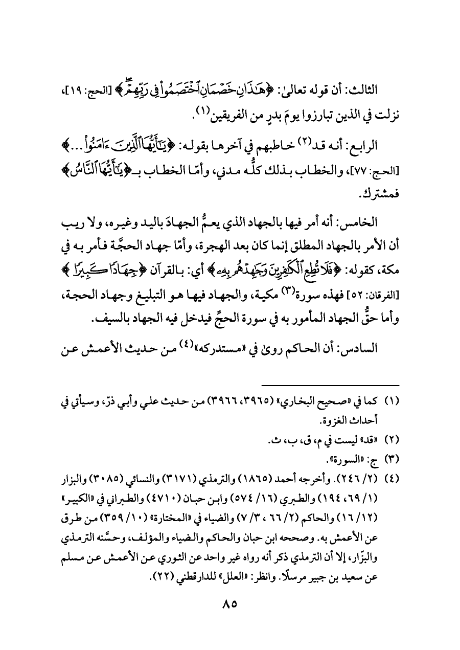 الخامس: أنه أمر فيها بالجهاد الذي يعمُّ الجهادَ باليد وغيره، ولا ريب أن الأمر بالجهاد المطلق إنما كان بعد الهجرة، وأمّا جهاد الحجَّة فأمر به في مكة، كقوله: {(٥١) فَلَا تُطِعِ الْكَافِرِينَ وَجَاهِدْهُمْ} أي: بالقرآن {بِهِ جِهَادًا} [الفرقان: ٥٢] فهذه سورة (¬٣) مكية، والجهاد فيها هو التبليغ وجهاد الحجة، وأما حقُّ الجهاد المأمور به في سورة الحجِّ فيدخل فيه الجهاد بالسيف.