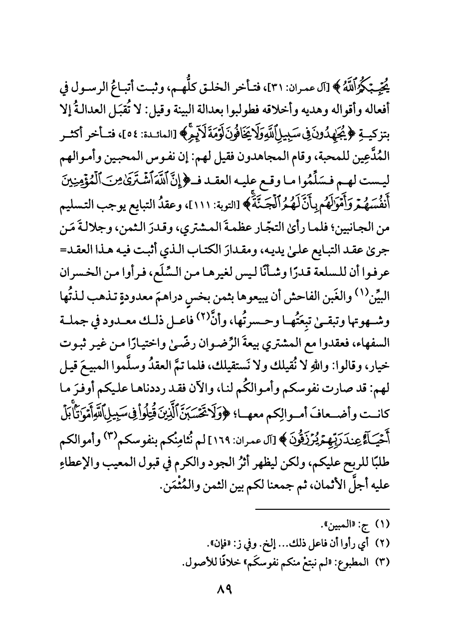 فاعل ذلك معدود في جملة السفهاء، فعقدوا مع المشتري بيعةَ الرِّضوان رضًى واختيارًا من غير ثبوت خيار، وقالوا: واللهِ لا نُقيلك ولا نَستقيلك، فلما تمَّ العقدُ وسلَّموا المبيعَ قيل لهم: قد صارت نفوسكم وأموالكُم لنا، والآن فقد رددناها عليكم أوفرَ ما كانت وأضعافَ أموالِكم معها؛ {وَلَا تَحْسَبَنَّ الَّذِينَ قُتِلُوا فِي سَبِيلِ اللَّهِ أَمْوَاتًا بَلْ أَحْيَاءٌ عِنْدَ رَبِّهِمْ يُرْزَقُونَ} [آل عمران: ١٦٩] لم نُثامِنْكم بنفوسكم (¬٣) وأموالكم طلبًا للربح عليكم، ولكن ليظهر أثرُ الجود والكرم في قبول المعيب والإعطاءِ عليه أجلَّ الأثمان، ثم جمعنا لكم بين الثمن والمُثْمَن.