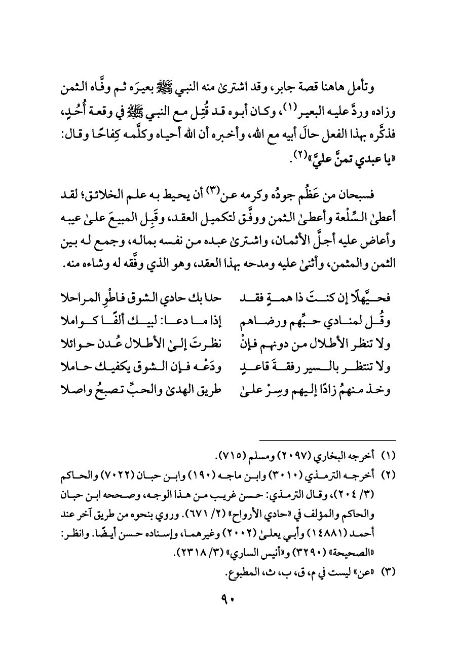 وتأمل هاهنا قصة جابر، وقد اشترى منه النبي - صلى الله عليه وسلم - بعيرَه ثم وفَّاه الثمن وزاده وردَّ عليه البعير (¬١)، وكان أبوه قد قُتِل مع النبي - صلى الله عليه وسلم - في وقعة أُحُدٍ، فذكَّره بهذا الفعل حالَ أبيه مع الله، وأخبره أن الله أحياه وكلَّمه كِفاحًا وقال: «يا عبدي تمنَّ عليَّ» (¬٢).