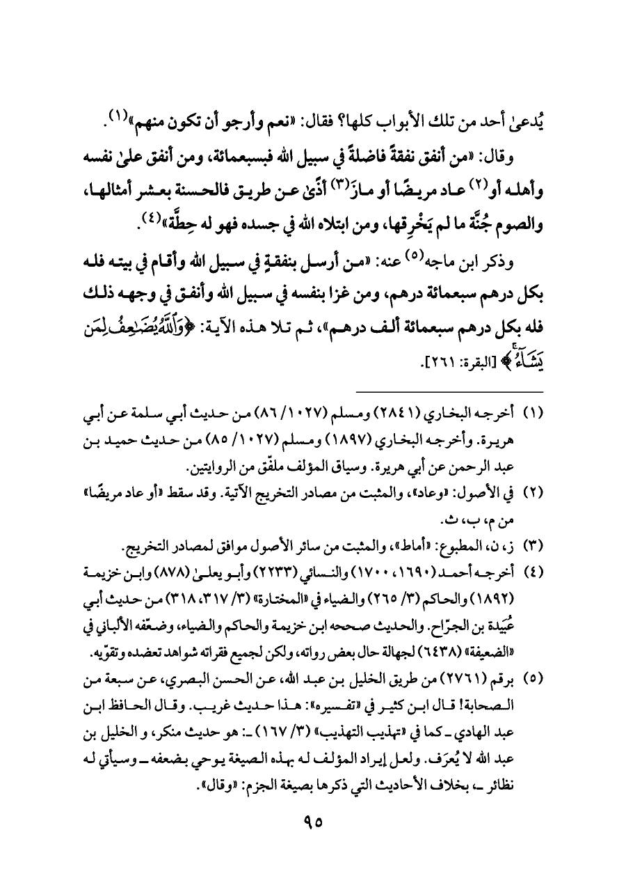 وذكر ابن ماجه (¬٥) عنه: «من أرسل بنفقةٍ في سبيل الله وأقام في بيته فله بكل درهم سبعمائة درهم، ومن غزا بنفسه في سبيل الله وأنفق في وجهه ذلك فله بكل درهم سبعمائة ألف درهم»، ثم تلا هذه الآية: {وَاللَّهُ يُضَاعِفُ لِمَنْ يَشَاءُ} [البقرة: ٢٦١].