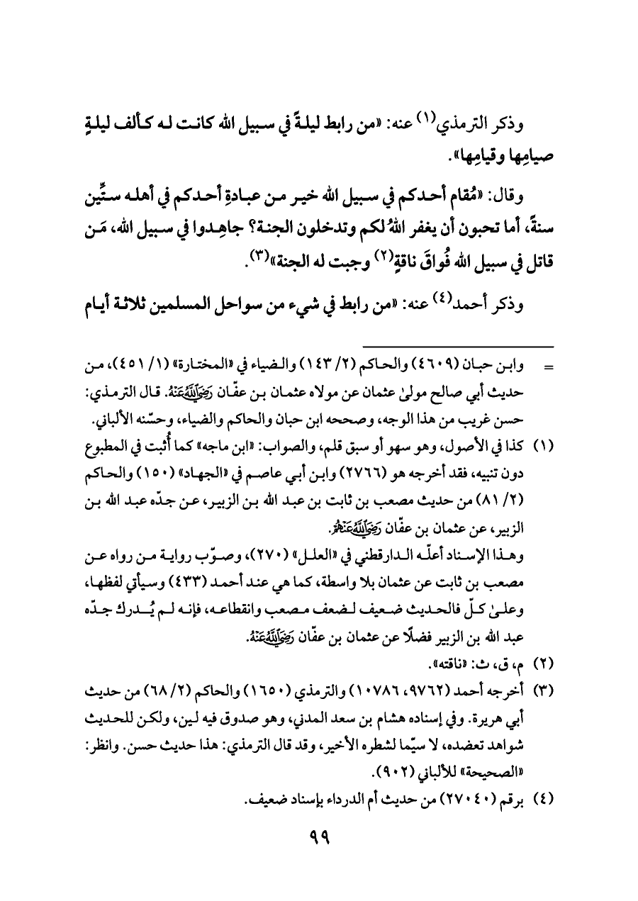 وذكر الترمذي (¬١) عنه: «من رابط ليلةً في سبيل الله كانت له كألف ليلةٍ صيامِها وقيامِها».