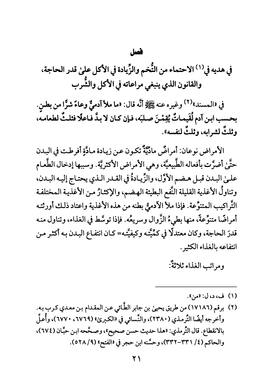 في «المسند» (¬٢) وغيره عنه - صلى الله عليه وسلم - أنَّه قال: «ما ملأ آدميٌّ وعاءً شرًّا من بطنٍ. بحسب ابن آدم لُقَيماتٌ يُقِمْنَ صلبَه، فإن كان لا بدَّ فاعلًا فثلثٌ لطعامه، وثلثٌ لشرابه، وثلثٌ لنفسه».