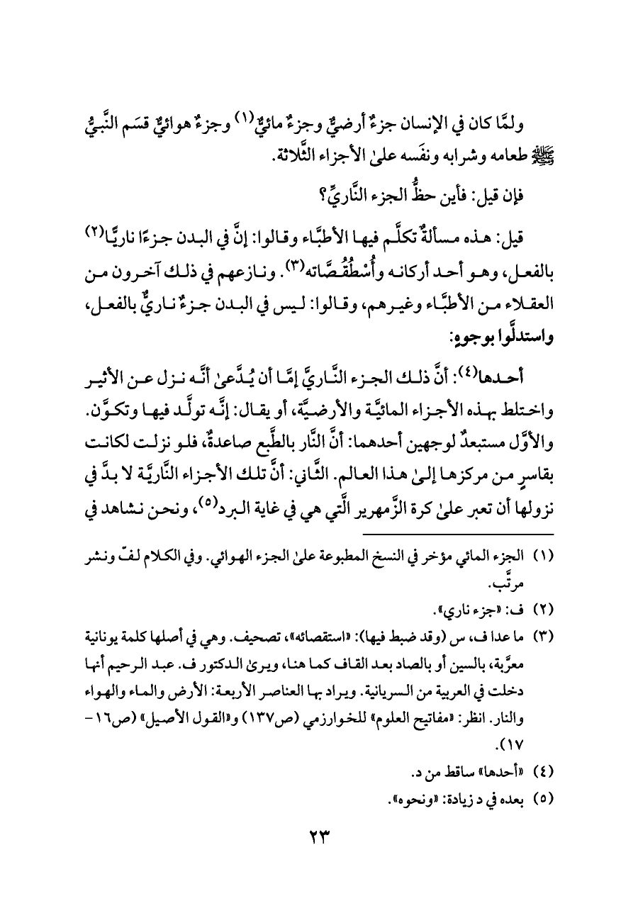 قيل: هذه مسألةٌ تكلَّم فيها الأطبَّاء وقالوا: إنَّ في البدن جزءًا ناريًّا (¬٢) بالفعل، وهو أحد أركانه وأُسْطُقُصَّاته (¬٣). ونازعهم في ذلك آخرون من العقلاء من الأطبَّاء وغيرهم، وقالوا: ليس في البدن جزءٌ ناريٌّ بالفعل، واستدلَّوا بوجوهٍ: