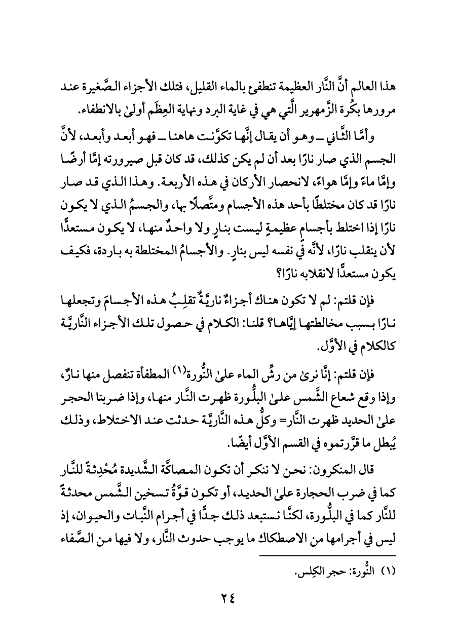 هذا العالم أنَّ النَّار العظيمة تنطفئ بالماء القليل، فتلك الأجزاء الصَّغيرة عند مرورها بكُرة الزَّمهرير الَّتي هي في غاية البرد ونهاية العِظَم أولى بالانطفاء.