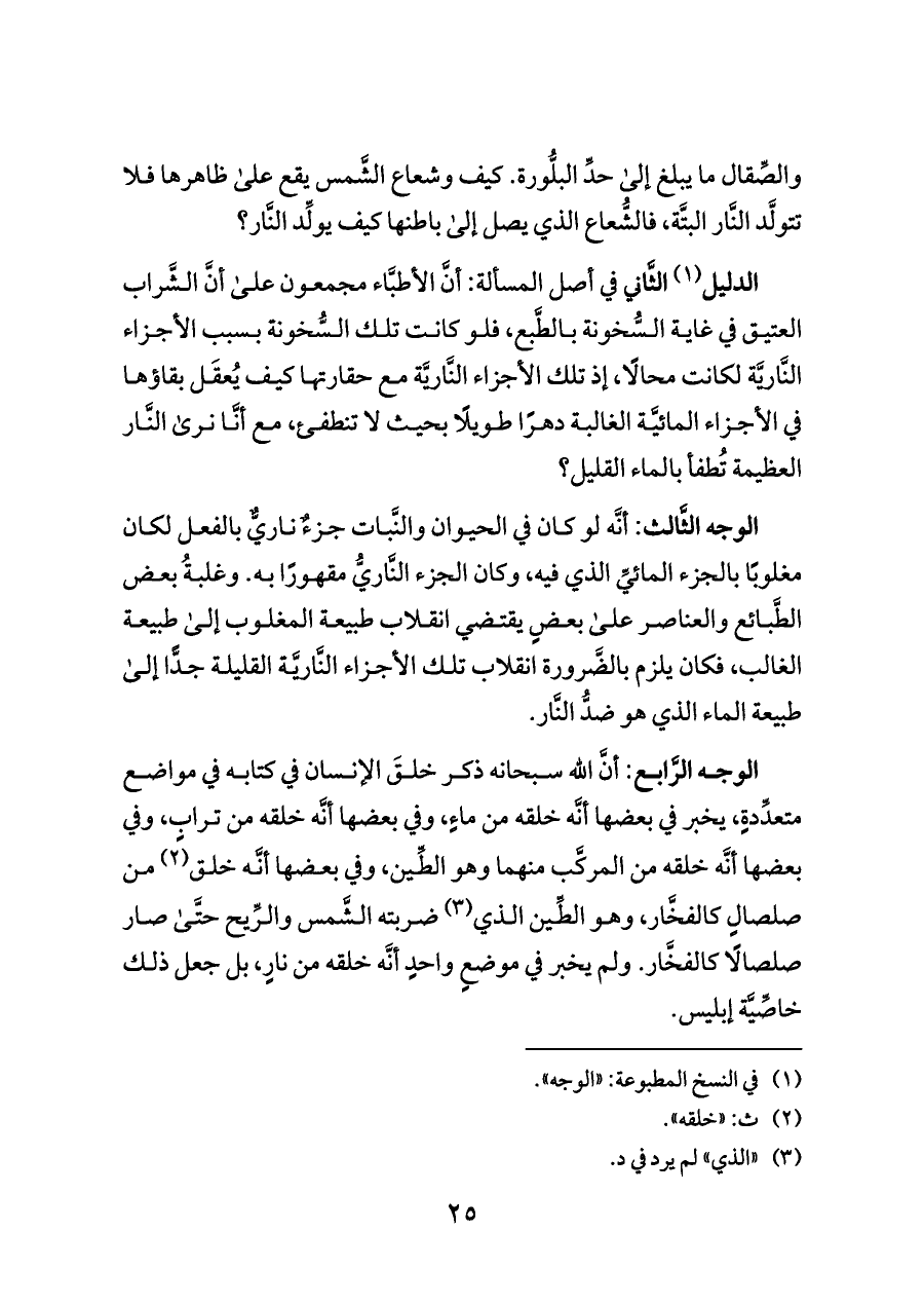 الوجه الثَّالث: أنَّه لو كان في الحيوان والنَّبات جزءٌ ناريٌّ بالفعل لكان مغلوبًا بالجزء المائيِّ الذي فيه، وكان الجزء النَّاريُّ مقهورًا به. وغلبةُ بعض الطَّبائع والعناصر على بعضٍ يقتضي انقلاب طبيعة المغلوب إلى طبيعة الغالب، فكان يلزم بالضَّرورة انقلاب تلك الأجزاء النَّاريَّة القليلة جدًّا إلى طبيعة الماء الذي هو ضدُّ النَّار.