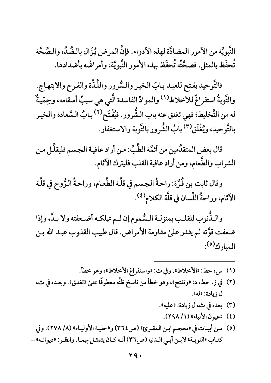 فالتَّوحيد يفتح للعبد بابَ الخير والسُّرور واللَّذَّة والفرح والابتهاج. والتَّوبةُ استفراغٌ للأخلاط (¬١) والموادِّ الفاسدة الَّتي هي سببُ أسقامه، وحِمْيةٌ له من التَّخليط؛ فهي تغلق عنه باب الشُّرور. فيُفْتَح (¬٢) بابُ السَّعادة والخير بالتَّوحيد، ويُغْلَق (¬٣) بابُ الشُّرور بالتَّوبة والاستغفار.