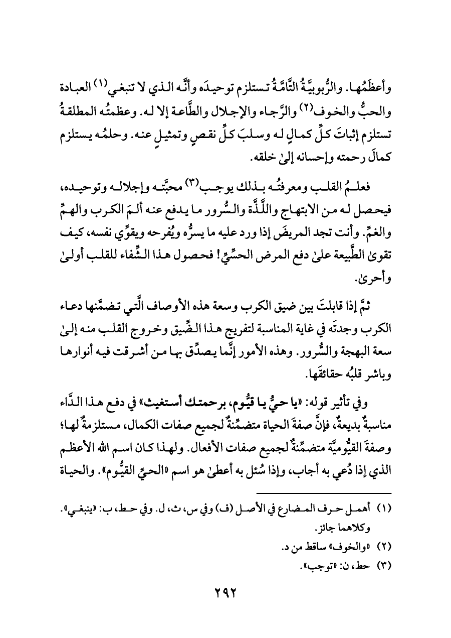 فعلمُ القلب ومعرفتُه بذلك يوجب (¬٣) محبَّته وإجلاله وتوحيده، فيحصل له من الابتهاج واللَّذَّة والسُّرور ما يدفع عنه ألمَ الكرب والهمِّ والغمِّ. وأنت تجد المريضَ إذا ورد عليه ما يسرُّه ويُفرحه ويقوِّي نفسه، كيف تقوى الطَّبيعة على دفع المرض الحسِّيِّ! فحصول هذا الشِّفاء للقلب أولى وأحرى.
