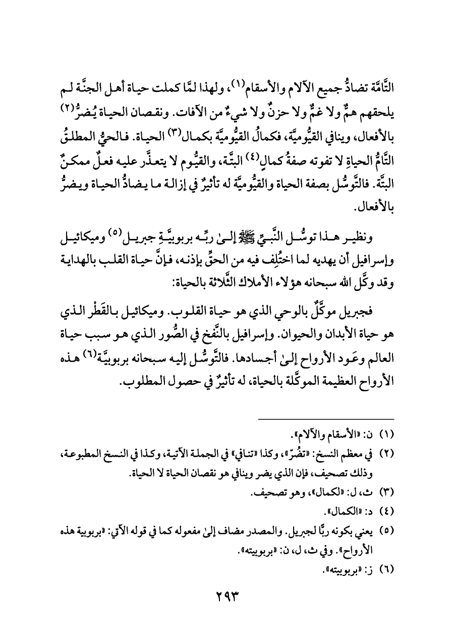 ونظير هذا توسُّل النَّبيِّ - صلى الله عليه وسلم - إلى ربِّه بربوبيَّةِ جبريل (¬٥) وميكائيل وإسرافيل أن يهديه لما اختُلِف فيه من الحقِّ بإذنه، فإنَّ حياة القلب بالهداية وقد وكَّل الله سبحانه هؤلاء الأملاك الثَّلاثة بالحياة: