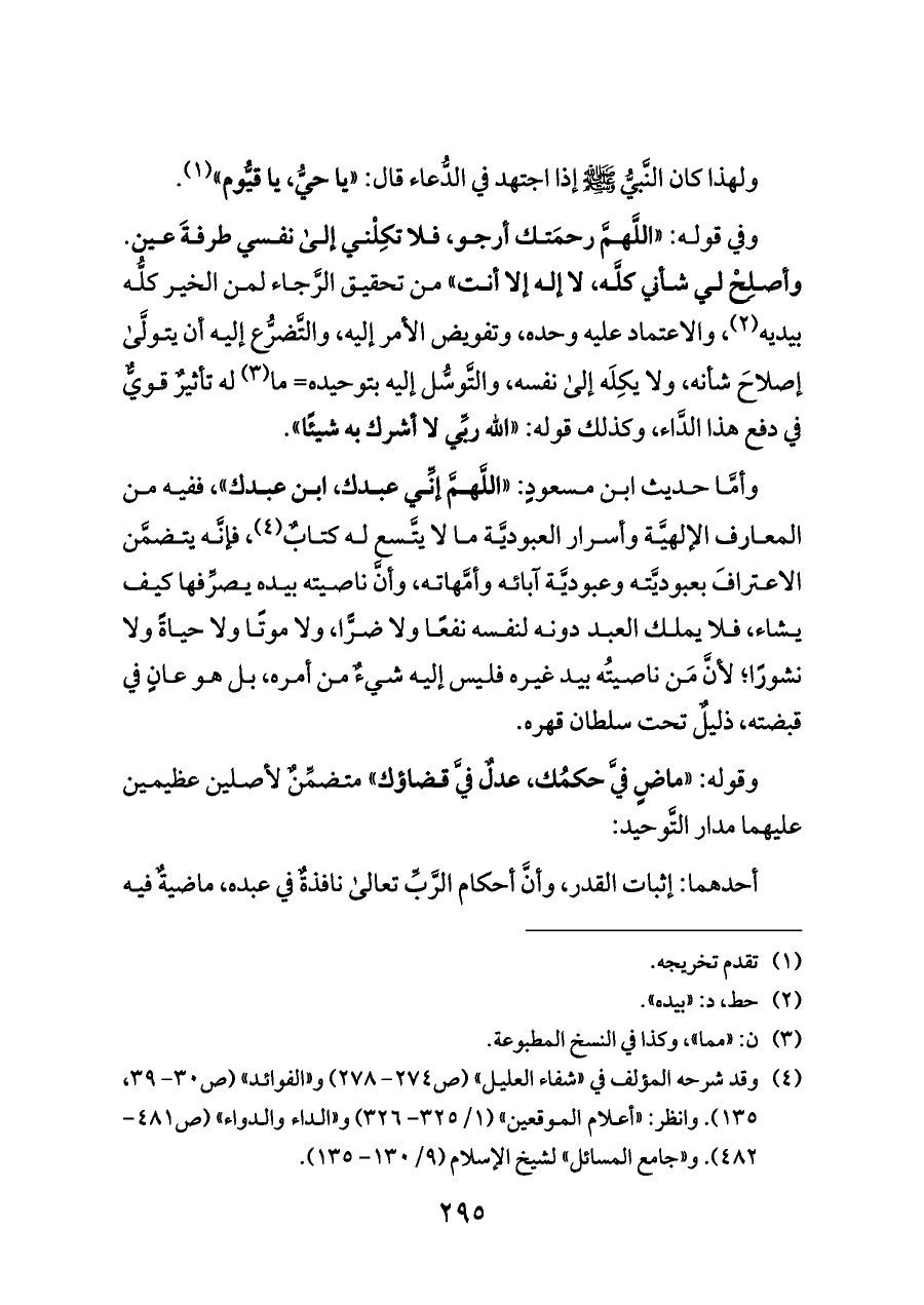 وقوله: «ماضٍ فيَّ حكمُك, عدلٌ فيَّ قضاؤك» متضمِّنٌ لأصلين عظيمين عليهما مدار التَّوحيد: