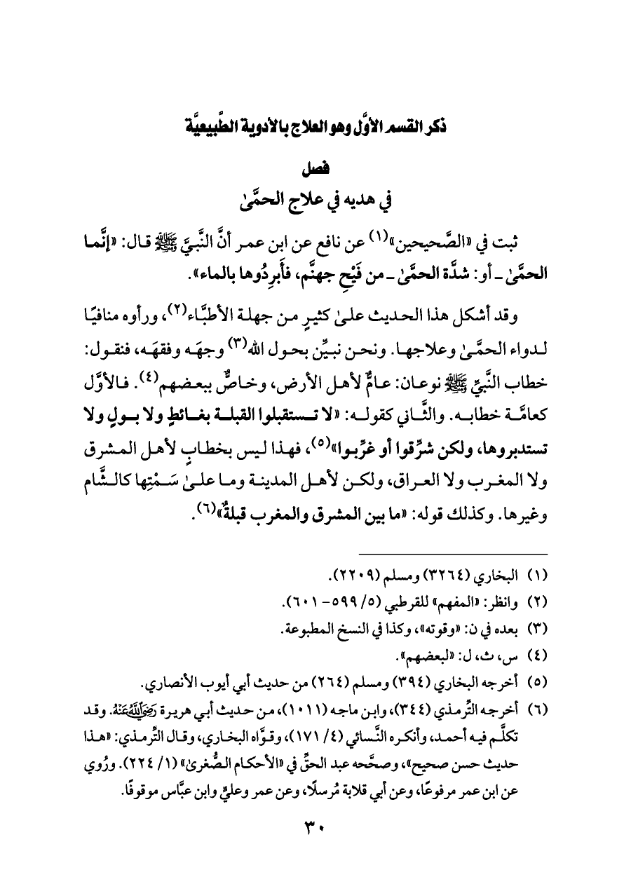 وقد أشكل هذا الحديث على كثيرٍ من جهلة الأطبَّاء (¬٢)، ورأوه منافيًا لدواء الحمَّى وعلاجها. ونحن نبيِّن بحول الله (¬٣) وجهَه وفقهَه، فنقول: خطاب النَّبيِّ - صلى الله عليه وسلم - نوعان: عامٌّ لأهل الأرض، وخاصٌّ ببعضهم (¬٤). فالأوَّل كعامَّة خطابه. والثَّاني كقوله: «لا تستقبلوا القبلة بغائطٍ ولا بولٍ ولا تستدبروها، ولكن شرِّقوا أو غرِّبوا» (¬٥)، فهذا ليس بخطابٍ لأهل المشرق ولا المغرب ولا العراق، ولكن لأهل المدينة وما على سَمْتِها كالشَّام وغيرها. وكذلك قوله: «ما بين المشرق والمغرب قبلةٌ» (¬٦).