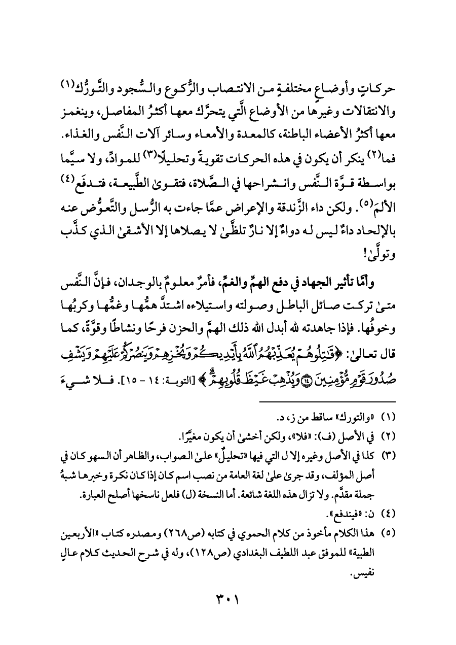 حركاتٍ وأوضاعٍ مختلفةٍ من الانتصاب والرُّكوع والسُّجود والتَّورُّك (¬١) والانتقالات وغيرها من الأوضاع الَّتي يتحرَّك معها أكثرُ المفاصل، وينغمز معها أكثرُ الأعضاء الباطنة، كالمعدة والأمعاء وسائر آلات النَّفس والغذاء. فما (¬٢) ينكر أن يكون في هذه الحركات تقويةً وتحليلًا (¬٣) للموادِّ، ولا سيَّما بواسطة قوَّة النَّفس وانشراحها في الصَّلاة، فتقوى الطَّبيعة، فتدفَع (¬٤) الألمَ (¬٥). ولكن داء الزَّندقة والإعراض عمَّا جاءت به الرُّسل والتَّعوُّض عنه بالإلحاد داءٌ ليس له دواءٌ إلا نارٌ تلظَّى لا يصلاها إلا الأشقى الذي كذَّب وتولَّى!