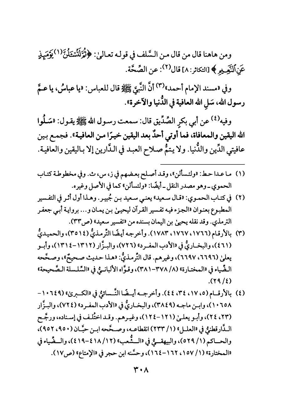 (¬١) ما عدا حط: «ولتسألن»، وقد أصلح بعضهم في ز، س، ث. وفي مخطوطة كتاب الحموي ــ وهو مصدر النقل ــ أيضًا: «ولتسألن» كما في الأصل وغيره.