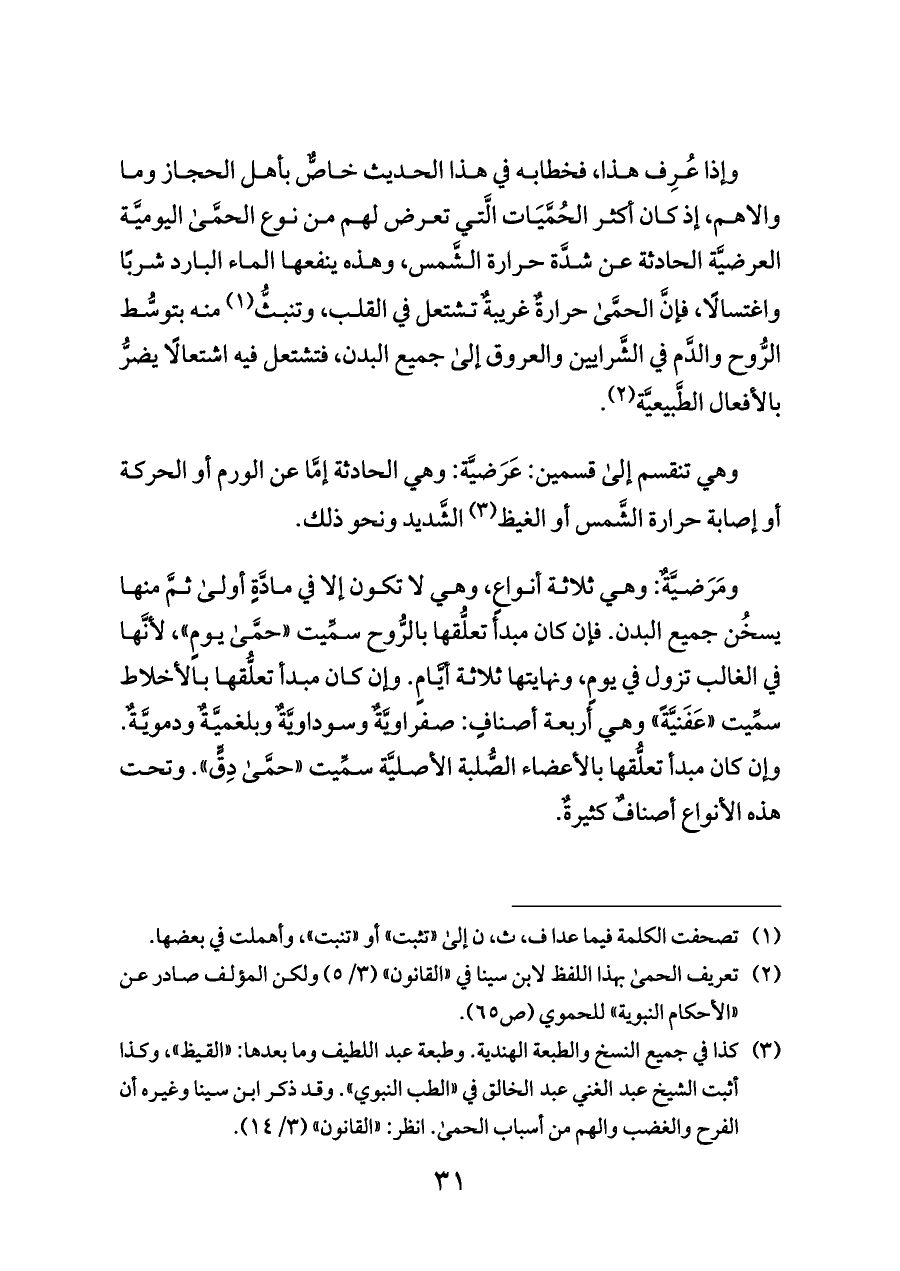 (¬٢) تعريف الحمى بهذا اللفظ لابن سينا في «القانون» (٣/ ٥) ولكن المؤلف صادر عن «الأحكام النبوية» للحموي (ص ٦٥).