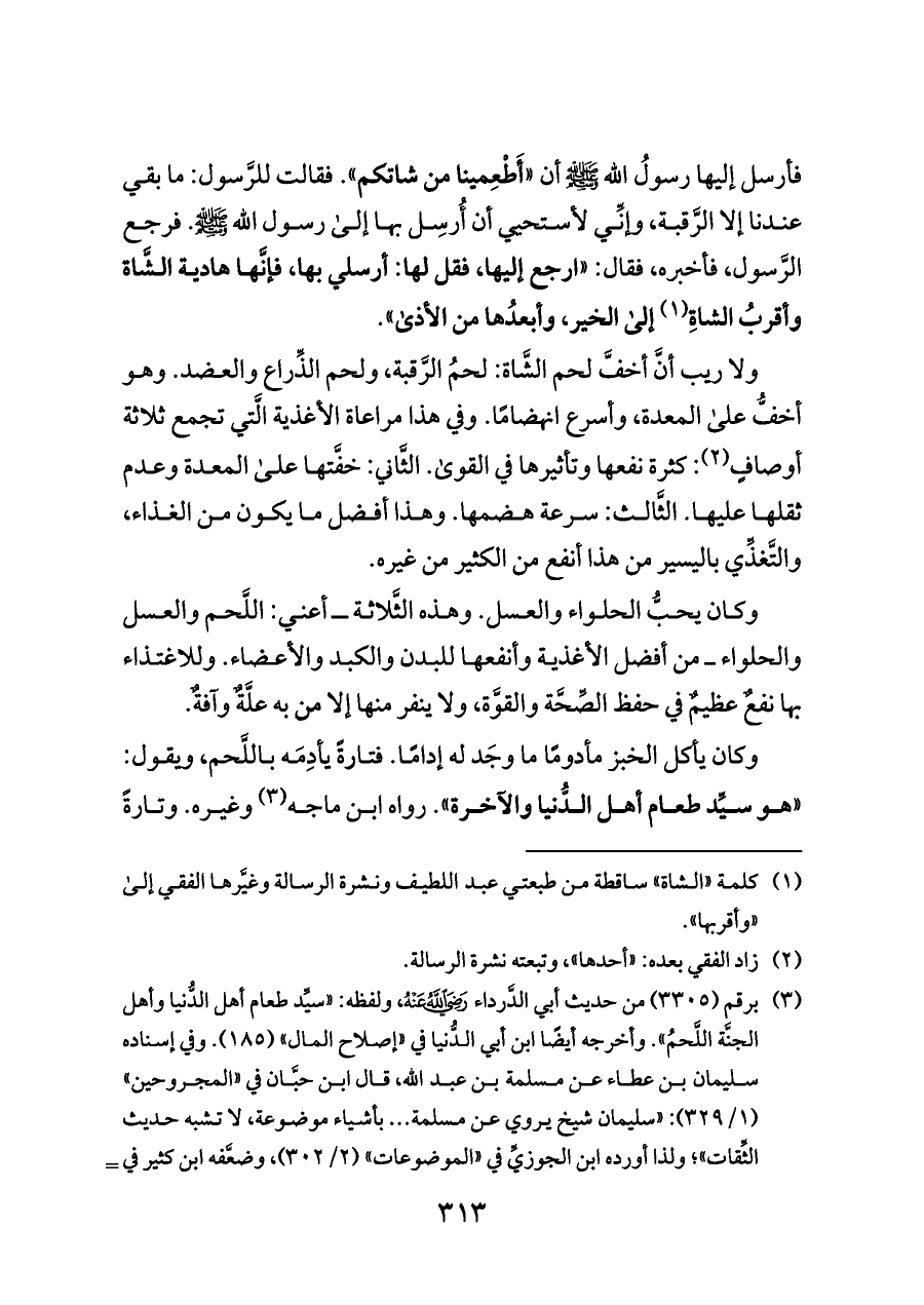 ولا ريب أنَّ أخفَّ لحم الشَّاة: لحمُ الرَّقبة، ولحم الذِّراع والعضد. وهو أخفُّ على المعدة، وأسرع انهضامًا. وفي هذا مراعاة الأغذية الَّتي تجمع ثلاثة أوصافٍ (¬٢): كثرة نفعها وتأثيرها في القوى. الثَّاني: خفَّتها على المعدة وعدم ثقلها عليها. الثَّالث: سرعة هضمها. وهذا أفضل ما يكون من الغذاء، والتَّغذِّي باليسير من هذا أنفع من الكثير من غيره.