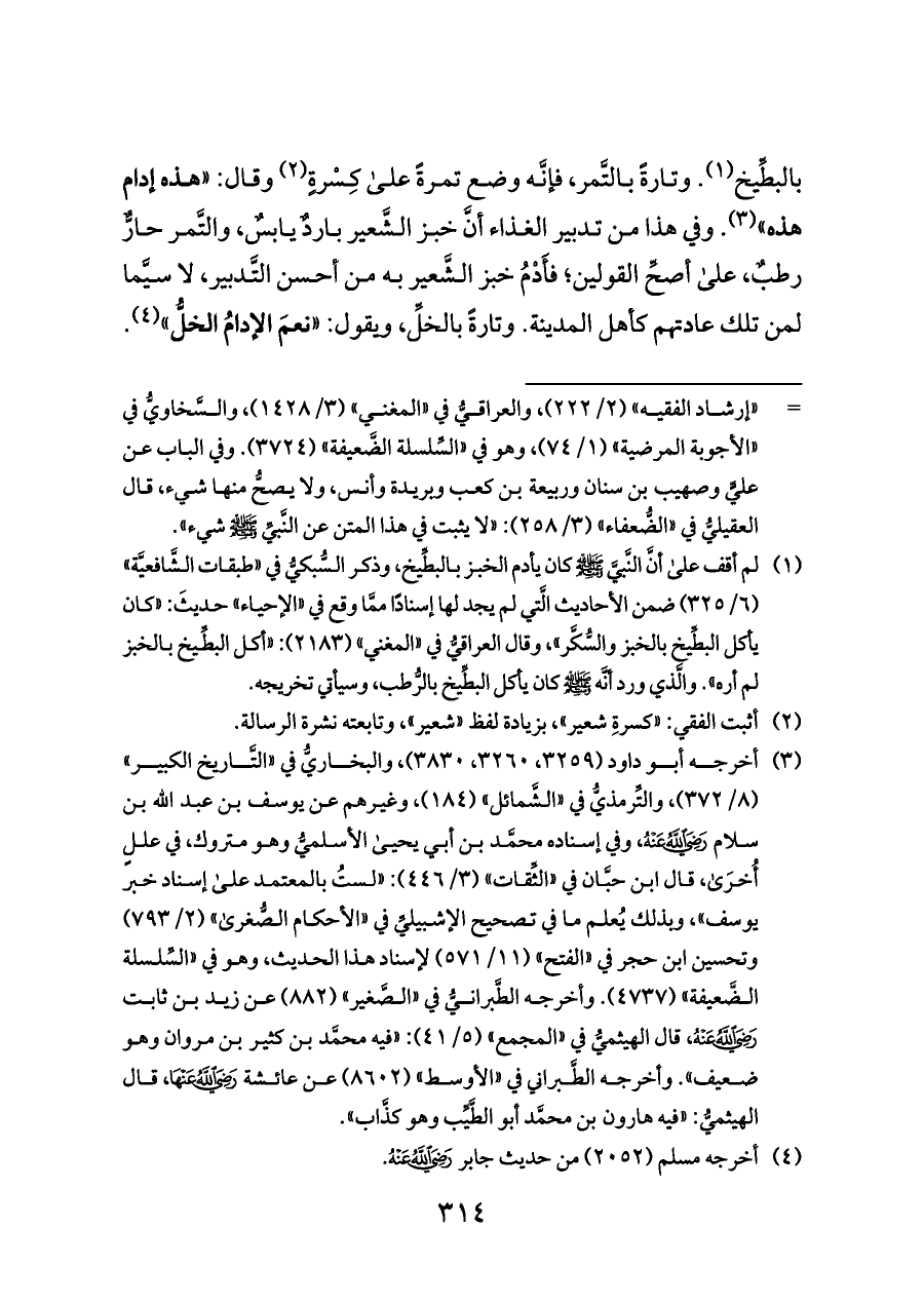 (¬٣) أخرجه أبو داود (٣٢٥٩، ٣٢٦٠، ٣٨٣٠)، والبخاريُّ في «التَّاريخ الكبير» (٨/ ٣٧٢)، والتِّرمذيُّ في «الشَّمائل» (١٨٤)، وغيرهم عن يوسف بن عبد الله بن سلام - رضي الله عنه -، وفي إسناده محمَّد بن أبي يحيى الأسلميُّ وهو متروك، في عللٍ أُخرَى، قال ابن حبَّان في «الثِّقات» (٣/ ٤٤٦): «لستُ بالمعتمد على إسناد خبر يوسف»، وبذلك يُعلم ما في تصحيح الإشبيليِّ في «الأحكام الصُّغرى» (٢/ ٧٩٣) وتحسين ابن حجر في «الفتح» (١١/ ٥٧١) لإسناد هذا الحديث، وهو في «السِّلسلة الضَّعيفة» (٤٧٣٧). وأخرجه الطَّبرانيُّ في «الصَّغير» (٨٨٢) عن زيد بن ثابت - رضي الله عنه -، قال الهيثميُّ في «المجمع» (٥/ ٤١): «فيه محمَّد بن كثير بن مروان وهو ضعيف». وأخرجه الطَّبراني في «الأوسط» (٨٦٠٢) عن عائشة - رضي الله عنها -، قال الهيثميُّ: «فيه هارون بن محمَّد أبو الطَّيِّب وهو كذَّاب».