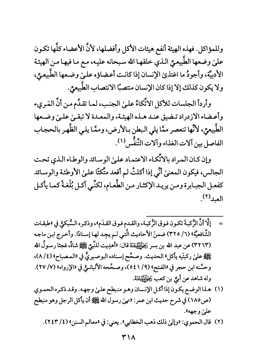 (¬١) هذا الوضع يكون إذا أكل الإنسان وهو منبطح على وجهه. وقد ذكره الحموي (ص ١٨٥) في شرح حديث ابن عمر: «نهى رسول الله - صلى الله عليه وسلم - أن يأكل الرجل وهو منبطح على وجهه».