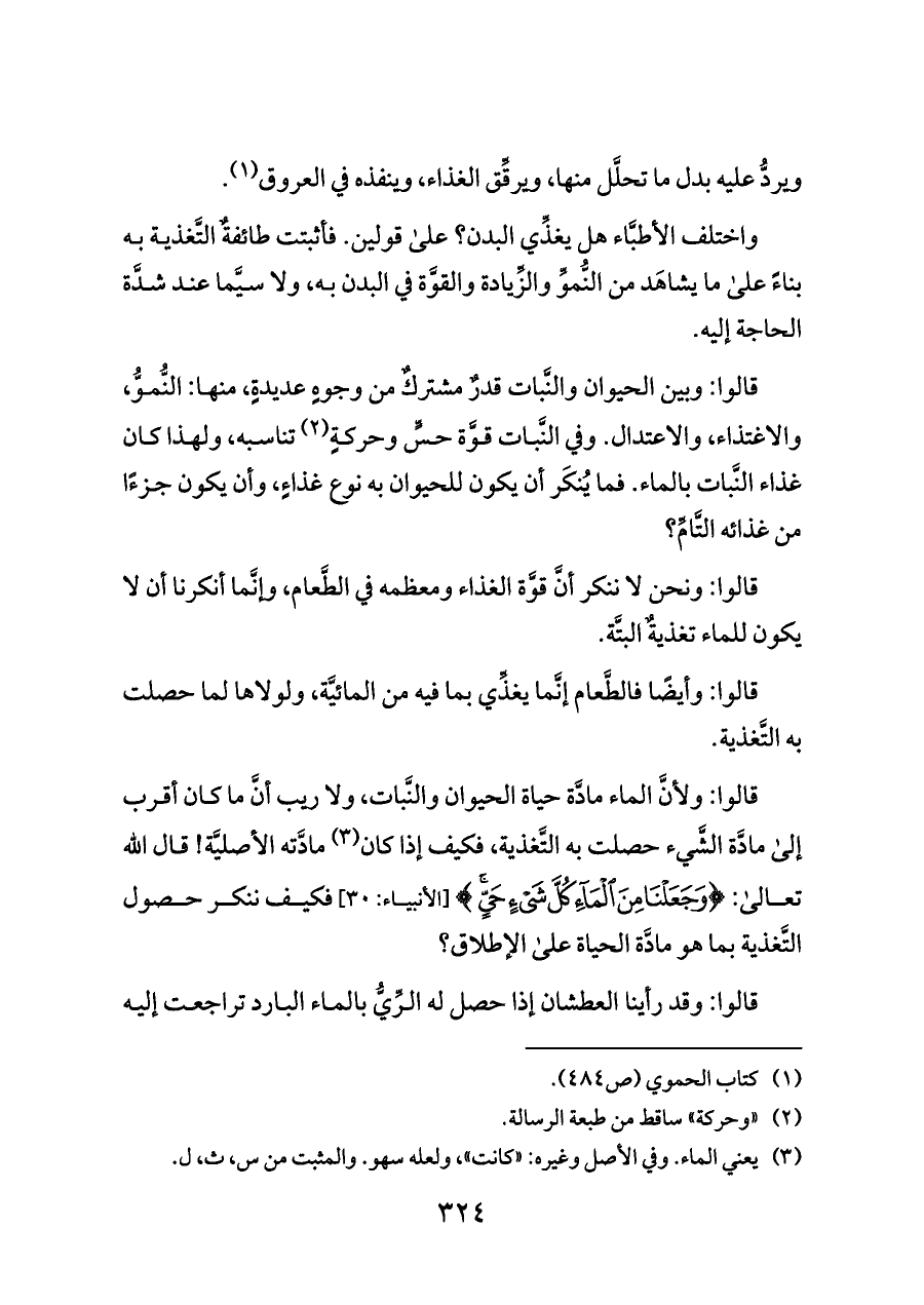 قالوا: ولأنَّ الماء مادَّة حياة الحيوان والنَّبات، ولا ريب أنَّ ما كان أقرب إلى مادَّة الشَّيء حصلت به التَّغذية، فكيف إذا كان (¬٣) مادَّته الأصليَّة! قال الله تعالى: {وَجَعَلْنَا مِنَ الْمَاءِ كُلَّ شَيْءٍ حَيٍّ} [الأنبياء: ٣٠] فكيف ننكر حصول التَّغذية بما هو مادَّة الحياة على الإطلاق؟