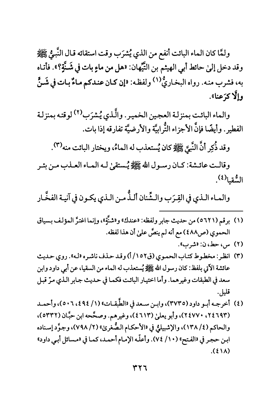 (¬٣) انظر: مخطوط كتاب الحموي (ق ١٥٢/أ) وقد حذف ناشره «له». روي حديث عائشة الآتي بلفظ: كان رسول الله - صلى الله عليه وسلم - يُستعذب له الماء من السقيا، عن أبي داود وابن سعد في الطبقات وغيرهما. وأما اختيار البائت فكما في حديث جابر الذي مرّ قبل قليل.