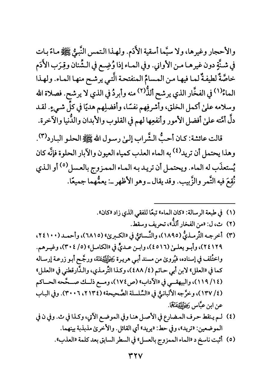قالت عائشة: كان أحبُّ الشَّراب إلى رسول الله - صلى الله عليه وسلم - الحلو البارد (¬٣). وهذا يحتمل أن تريد (¬٤) به الماء العذب كمياه العيون والآبار الحلوة فإنَّه كان يُستعذَب له الماء. ويحتمل أن تريد به الماء الممزوج بالعسل (¬٥) أو الذي نُقِعَ فيه التَّمر والزَّبيب. وقد يقال ــ وهو الأظهر ــ: يعمُّهما جميعًا.