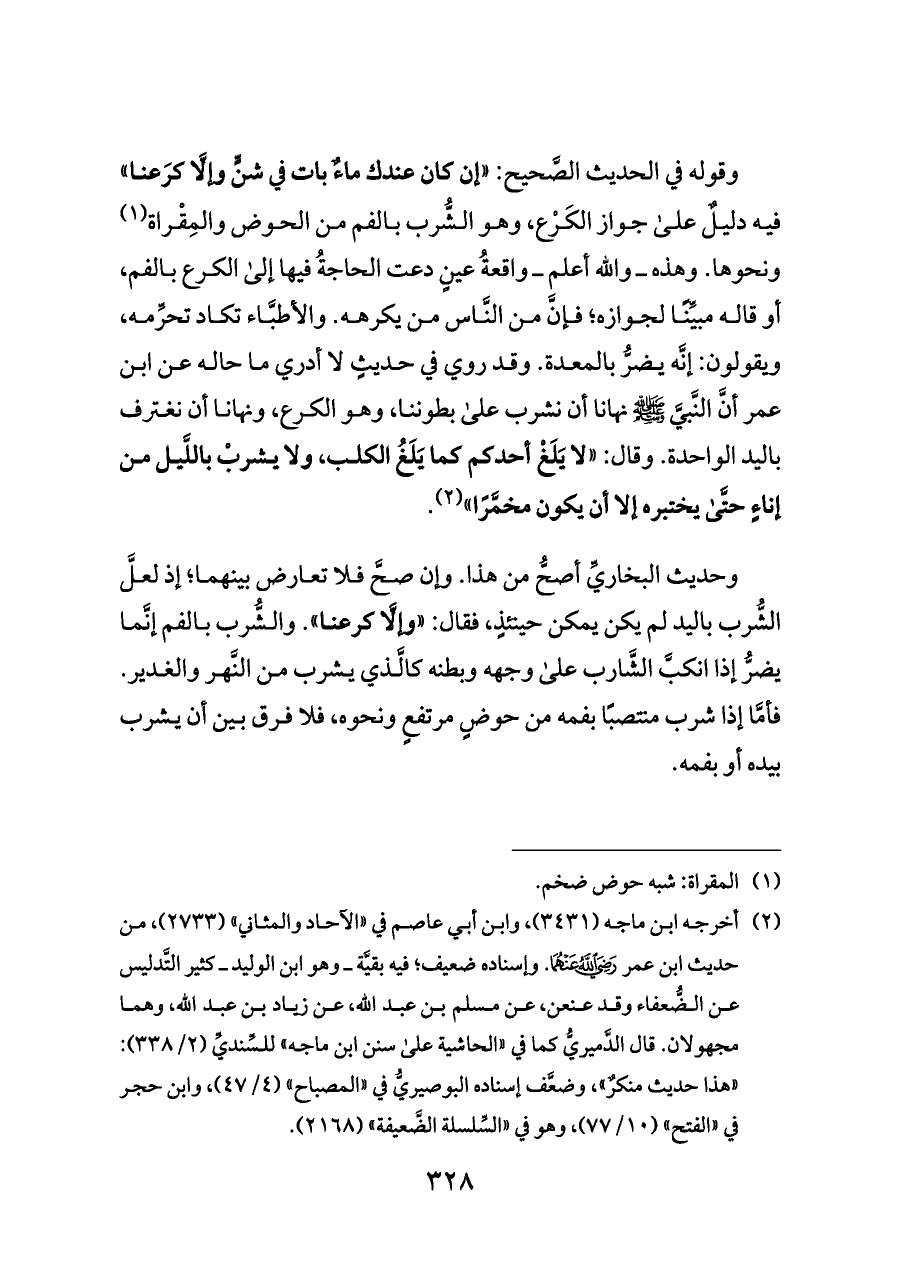 وحديث البخاريِّ أصحُّ من هذا. وإن صحَّ فلا تعارض بينهما؛ إذ لعلَّ الشُّرب باليد لم يكن يمكن حينئذٍ، فقال: «وإلَّا كرعنا». والشُّرب بالفم إنَّما يضرُّ إذا انكبَّ الشَّارب على وجهه وبطنه كالَّذي يشرب من النَّهر والغدير. فأمَّا إذا شرب منتصبًا بفمه من حوضٍ مرتفعٍ ونحوه، فلا فرق بين أن يشرب بيده أو بفمه.