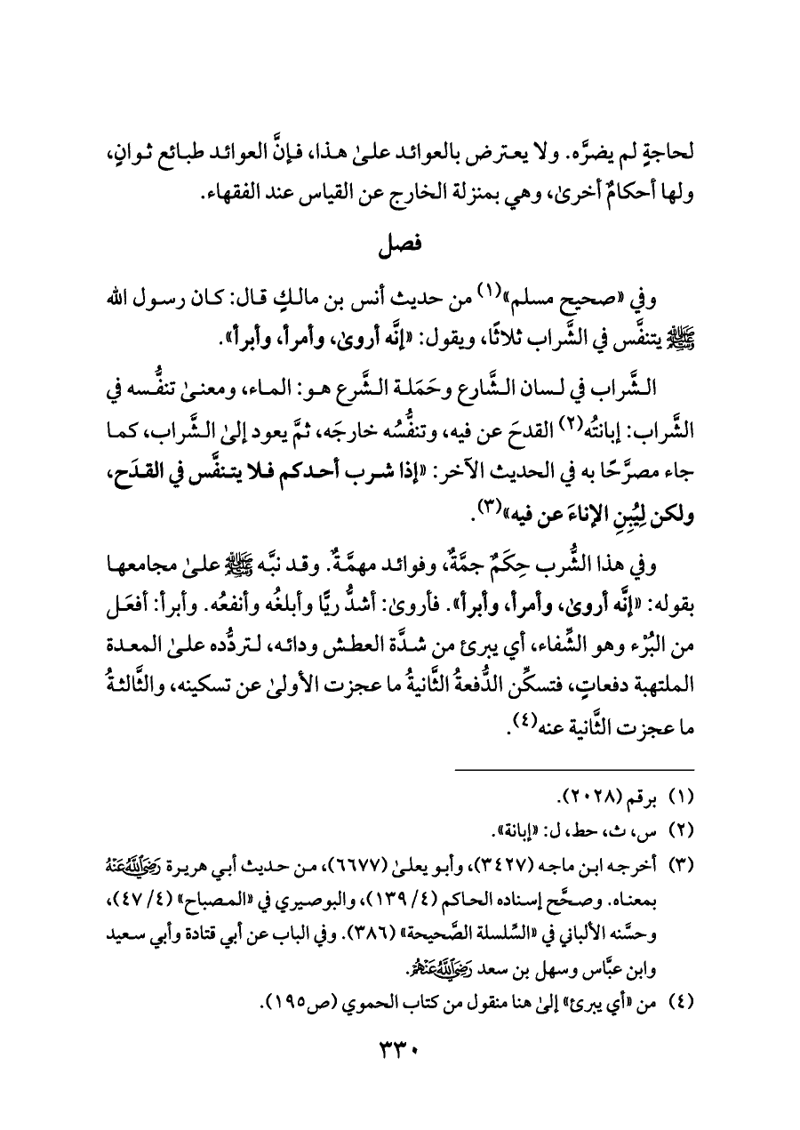 الشَّراب في لسان الشَّارع وحَمَلة الشَّرع هو: الماء، ومعنى تنفُّسه في الشَّراب: إبانتُه (¬٢) القدحَ عن فيه، وتنفُّسُه خارجَه، ثمَّ يعود إلى الشَّراب، كما جاء مصرَّحًا به في الحديث الآخر: «إذا شرب أحدكم فلا يتنفَّس في القدَح، ولكن لِيُبِنِ الإناءَ عن فيه» (¬٣).