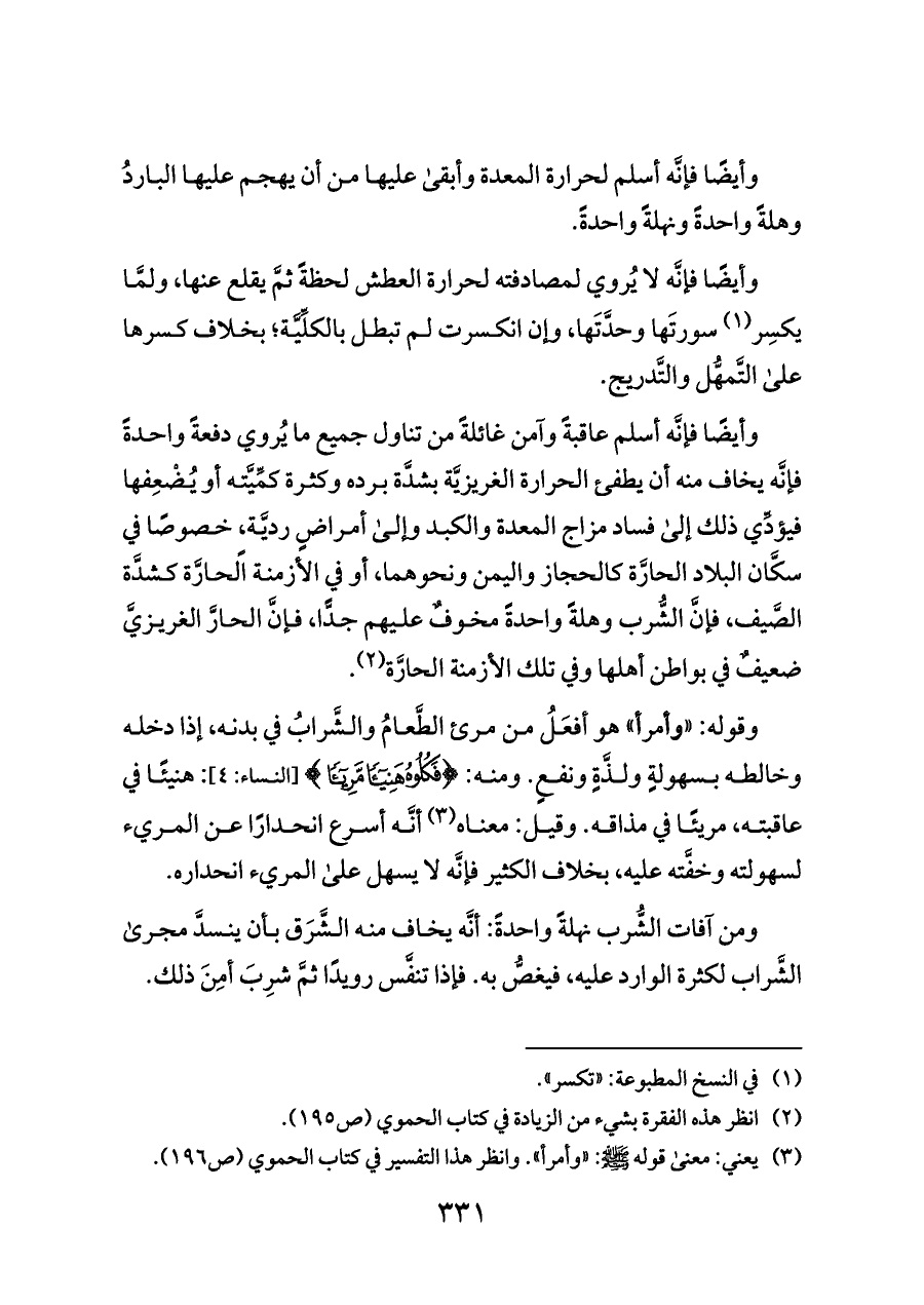 وأيضًا فإنَّه أسلم عاقبةً وآمن غائلةً من تناول جميع ما يُروي دفعةً واحدةً فإنَّه يخاف منه أن يطفئ الحرارة الغريزيَّة بشدَّة برده وكثرة كمِّيَّته أو يُضْعِفها فيؤدِّي ذلك إلى فساد مزاج المعدة والكبد وإلى أمراضٍ رديَّةٍ، خصوصًا في سكَّان البلاد الحارَّة كالحجاز واليمن ونحوهما، أو في الأزمنة الحارَّة كشدَّة الصَّيف، فإنَّ الشُّرب وهلةً واحدةً مخوفٌ عليهم جدًّا، فإنَّ الحارَّ الغريزيَّ ضعيفٌ في بواطن أهلها وفي تلك الأزمنة الحارَّة (¬٢).