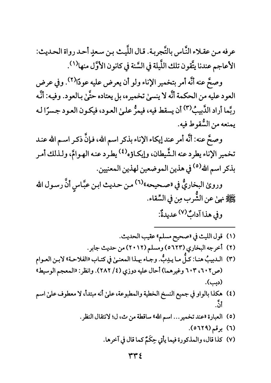وصحَّ عنه أنَّه أمر بتخمير الإناء ولو أن يعرض عليه عودًا (¬٢). وفي عرض العود عليه من الحكمة أنَّه لا ينسى تخميره، بل يعتاده حتَّى بالعود. وفيه: أنَّه ربَّما أراد الدَّبيبُ (¬٣) أن يسقط فيه، فيمرُّ على العود، فيكون العود جسرًا له يمنعه من السُّقوط فيه.