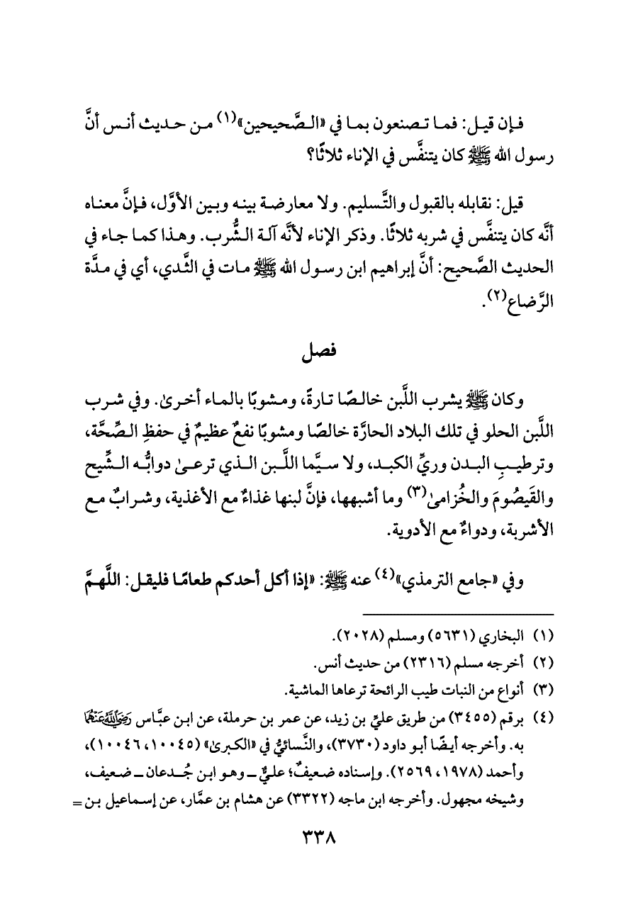قيل: نقابله بالقبول والتَّسليم. ولا معارضة بينه وبين الأوَّل، فإنَّ معناه أنَّه كان يتنفَّس في شربه ثلاثًا. وذكر الإناء لأنَّه آلة الشُّرب. وهذا كما جاء في الحديث الصَّحيح: أنَّ إبراهيم ابن رسول الله - صلى الله عليه وسلم - مات في الثَّدي، أي في مدَّة الرَّضاع (¬٢).