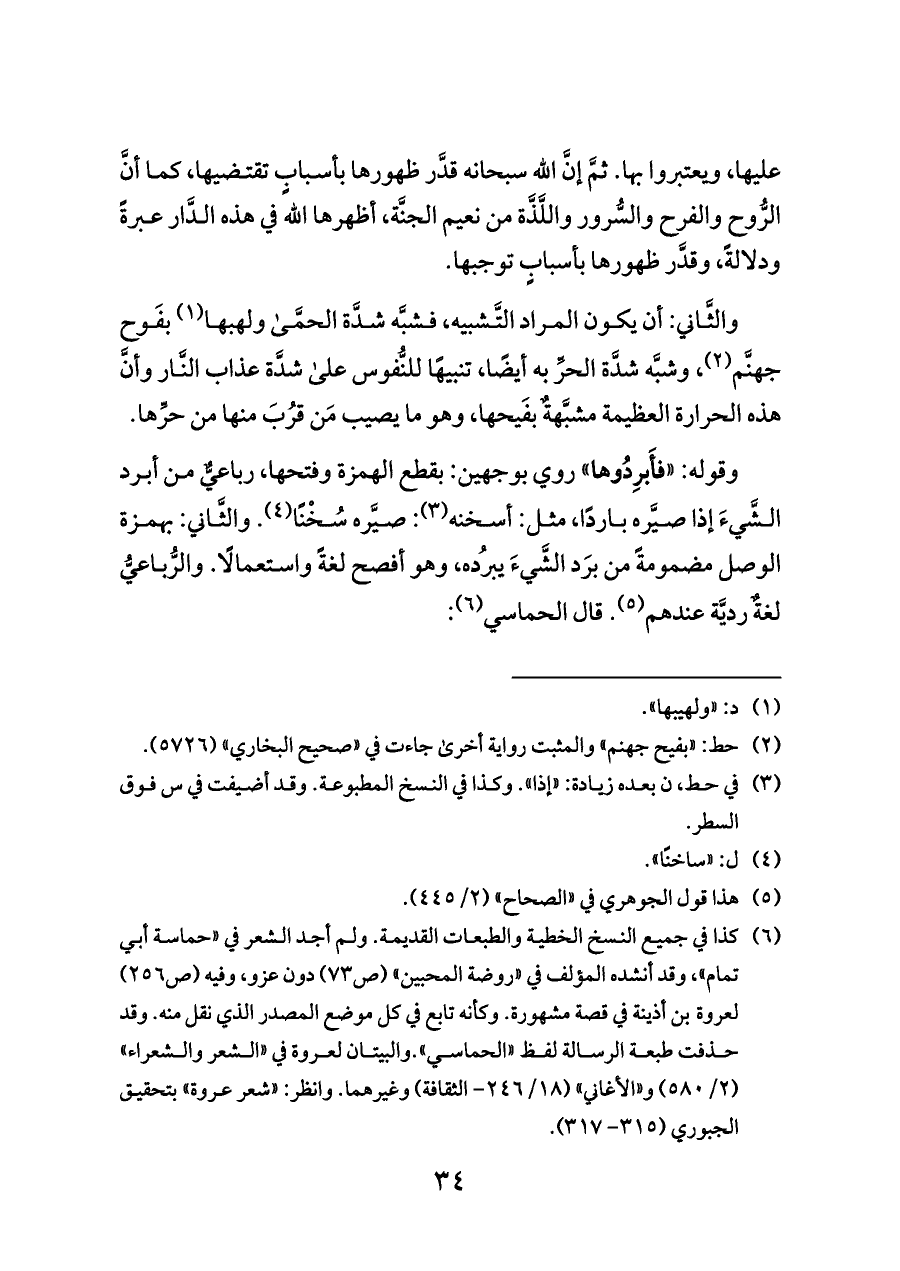 والثَّاني: أن يكون المراد التَّشبيه، فشبَّه شدَّة الحمَّى ولهبها (¬١) بفَوح جهنَّم (¬٢)، وشبَّه شدَّة الحرِّ به أيضًا، تنبيهًا للنُّفوس على شدَّة عذاب النَّار وأنَّ هذه الحرارة العظيمة مشبَّهةٌ بفَيحها، وهو ما يصيب مَن قرُبَ منها من حرِّها.