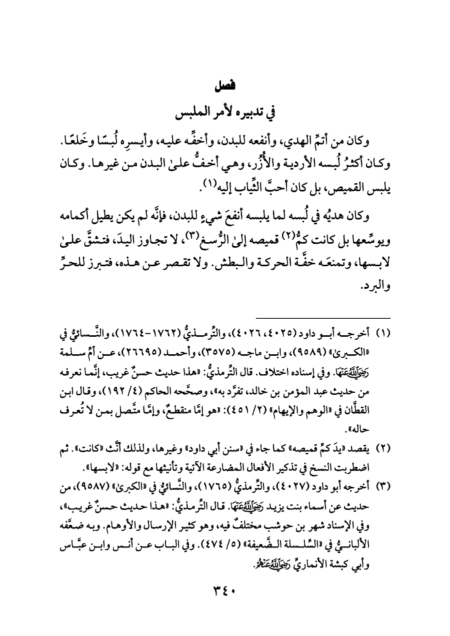 (¬٢) يقصد «يدَ كمِّ قميصه» كما جاء في «سنن أبي داود» وغيرها، ولذلك أنَّث «كانت». ثم اضطربت النسخ في تذكير الأفعال المضارعة الآتية وتأنيثها مع قوله: «لابسها».