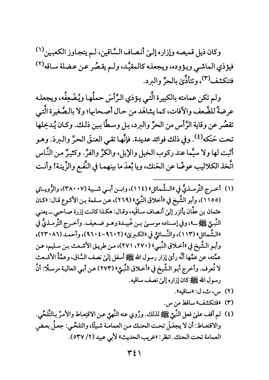 (¬١) أخرج التِّرمذيُّ في «الشَّمائل» (١١٤)، وابن أبي شيبة (٣٨٠٠٧)، والرُّوياني (١١٥٥)، وأبو الشَّيخ في «أخلاق النَّبيِّ» (٢٦٩)، عن سلمة بن الأكوع قال: «كان عثمان بن عفَّان يأتزر إلى أنصاف ساقَيه، وقال: هكذا كانت إزرة صاحبي ــ يعني النَّبيَّ - صلى الله عليه وسلم - ــ»، وفي إسناده موسى بن عُبيدة وهو ضعيف. وأخرج التِّرمذيُّ في «الشَّمائل» (١١٣)، والنَّسائيُّ في «الكبرى» (٩٦٠٢ - ٩٦٠٤)، وأحمد (٢٣٠٨٦)، وأبو الشَّيخ في «أخلاق النَّبي» (٢٧٠، ٢٧١)، من طريق الأشعث بن سليم، عن عمَّته، عن عمِّها أنَّه رأى إزار رسول الله - صلى الله عليه وسلم - أسفل إلى نصف السَّاق، وعمَّةُ الأشعث لا تُعرف. وأخرج أبو الشَّيخ في «أخلاق النَّبيِّ» (٢٧٣) عن أبي العالية مرسلًا: أنَّ رسول الله - صلى الله عليه وسلم - كان إزاره إلى نصف ساقيه.