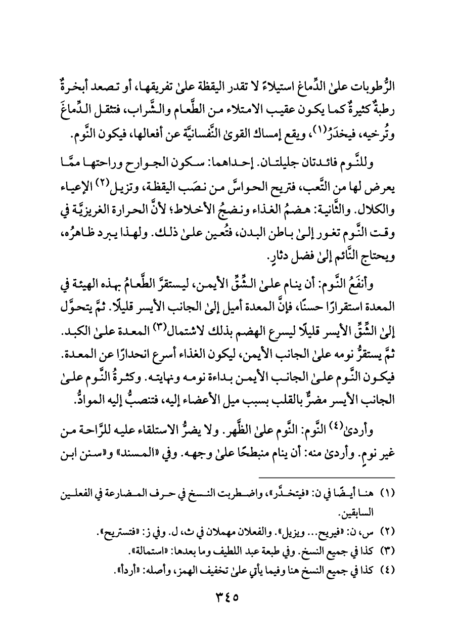 وأنفَعُ النَّوم: أن ينام على الشِّقِّ الأيمن، ليستقرَّ الطَّعامُ بهذه الهيئة في المعدة استقرارًا حسنًا، فإنَّ المعدة أميل إلى الجانب الأيسر قليلًا. ثمَّ يتحوَّل إلى الشِّقِّ الأيسر قليلًا ليسرع الهضم بذلك لاشتمال (¬٣) المعدة على الكبد. ثمَّ يستقرُّ نومه على الجانب الأيمن، ليكون الغذاء أسرع انحدارًا عن المعدة. فيكون النَّوم على الجانب الأيمن بداءة نومه ونهايته. وكثرةُ النَّوم على الجانب الأيسر مضرٌّ بالقلب بسبب ميل الأعضاء إليه، فتنصبُّ إليه الموادُّ.
