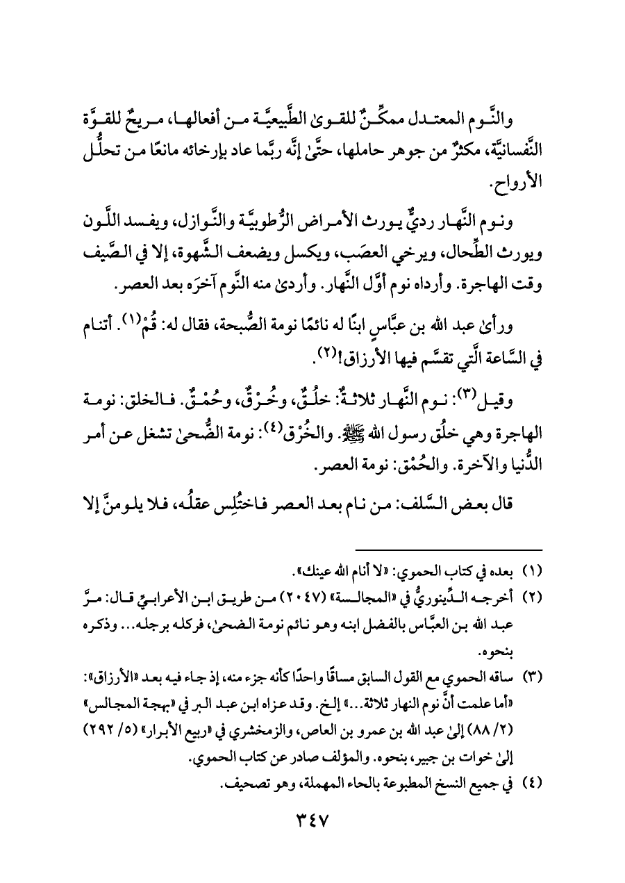 ونوم النَّهار رديٌّ يورث الأمراض الرُّطوبيَّة والنَّوازل، ويفسد اللَّون ويورث الطِّحال، ويرخي العصَب، ويكسل ويضعف الشَّهوة، إلا في الصَّيف وقت الهاجرة. وأرداه نوم أوَّل النَّهار. وأردى منه النَّوم آخرَه بعد العصر.