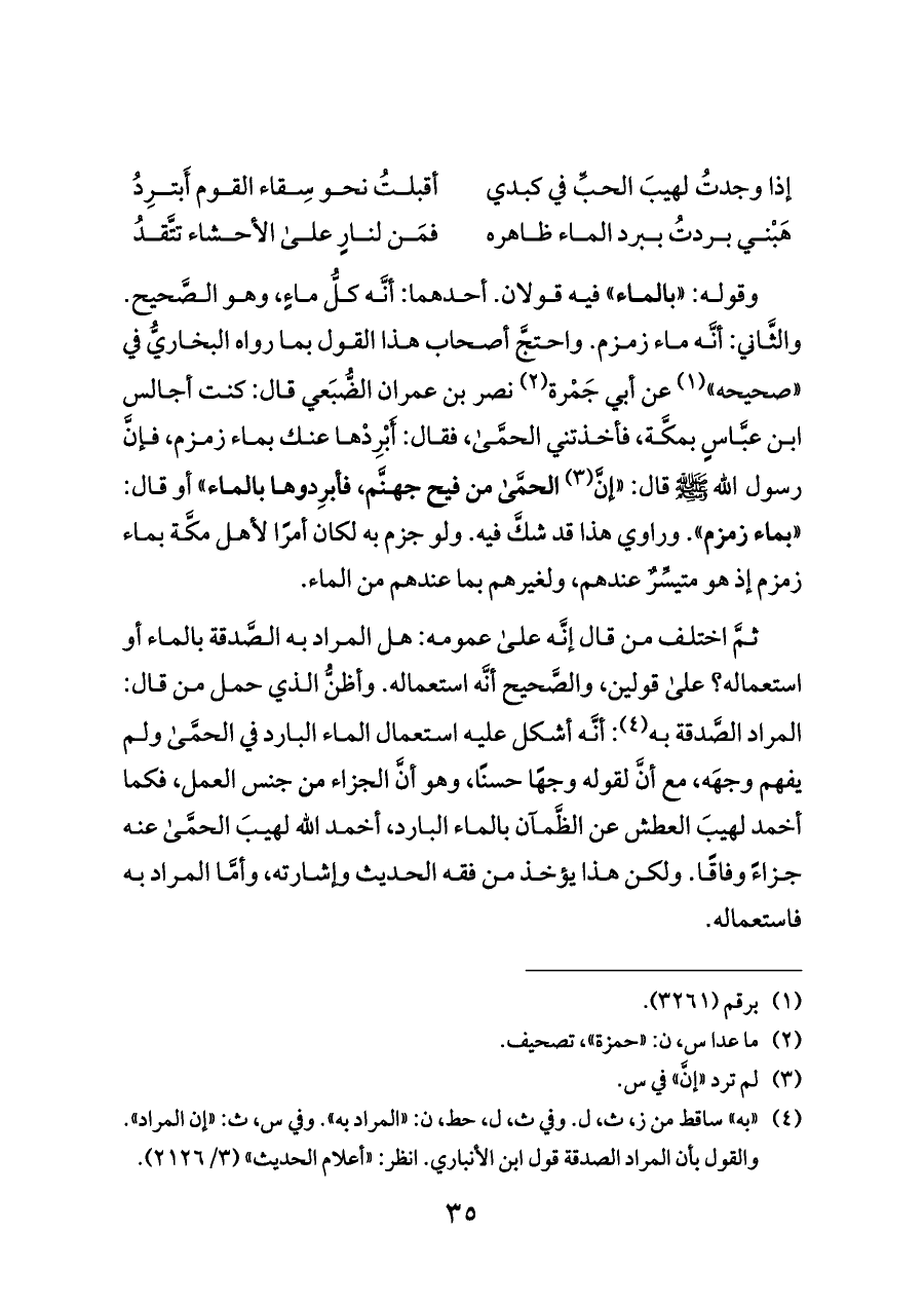 وقوله: «بالماء» فيه قولان. أحدهما: أنَّه كلُّ ماءٍ، وهو الصَّحيح. والثَّاني: أنَّه ماء زمزم. واحتجَّ أصحاب هذا القول بما رواه البخاريُّ في «صحيحه» (¬١) عن أبي جَمْرة (¬٢) نصر بن عمران الضُّبَعي قال: كنت أجالس ابن عبَّاسٍ بمكَّة، فأخذتني الحمَّى، فقال: أَبْرِدْها عنك بماء زمزم، فإنَّ رسول الله - صلى الله عليه وسلم - قال: «إنَّ (¬٣) الحمَّى من فيح جهنَّم، فأبرِدوها بالماء» أو قال: «بماء زمزم». وراوي هذا قد شكَّ فيه. ولو جزم به لكان أمرًا لأهل مكَّة بماء زمزم إذ هو متيسِّرٌ عندهم، ولغيرهم بما عندهم من الماء.