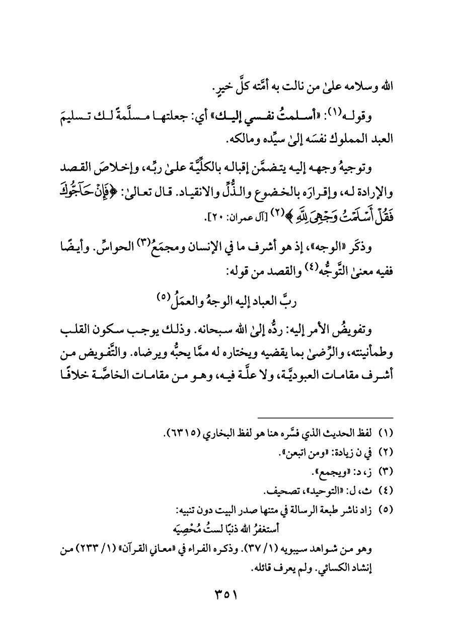 وتوجيهُ وجهه إليه يتضمَّن إقباله بالكلِّيَّة على ربِّه، وإخلاصَ القصد والإرادة له، وإقرارَه بالخضوع والذُّلِّ والانقياد. قال تعالى: {فَإِنْ حَاجُّوكَ فَقُلْ أَسْلَمْتُ وَجْهِيَ لِلَّهِ} (¬٢) [آل عمران: ٢٠].