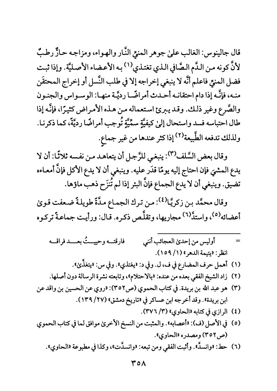 قال جالينوس: الغالب على جوهر المنيِّ النَّار والهواء، ومزاجه حارٌّ رطبٌ لأنَّ كونه من الدَّم الصَّافي الذي تغتذي (¬١) به الأعضاء الأصليَّة. وإذا ثبت فضل المنيِّ فاعلم أنَّه لا ينبغي إخراجه إلا في طلب النَّسل أو إخراج المحتقَن منه، فإنَّه إذا دام احتقانه أحدث أمراضًا رديَّة منها: الوسواس والجنون والصَّرع وغير ذلك. وقد يبرئ استعماله من هذه الأمراض كثيرًا، فإنَّه إذا طال احتباسه فسد واستحال إلى كيفيَّةٍ سمِّيَّةٍ تُوجب أمراضًا رديَّةً، كما ذكرنا. ولذلك تدفعه الطَّبيعة (¬٢) إذا كثر عندها من غير جماعٍ.