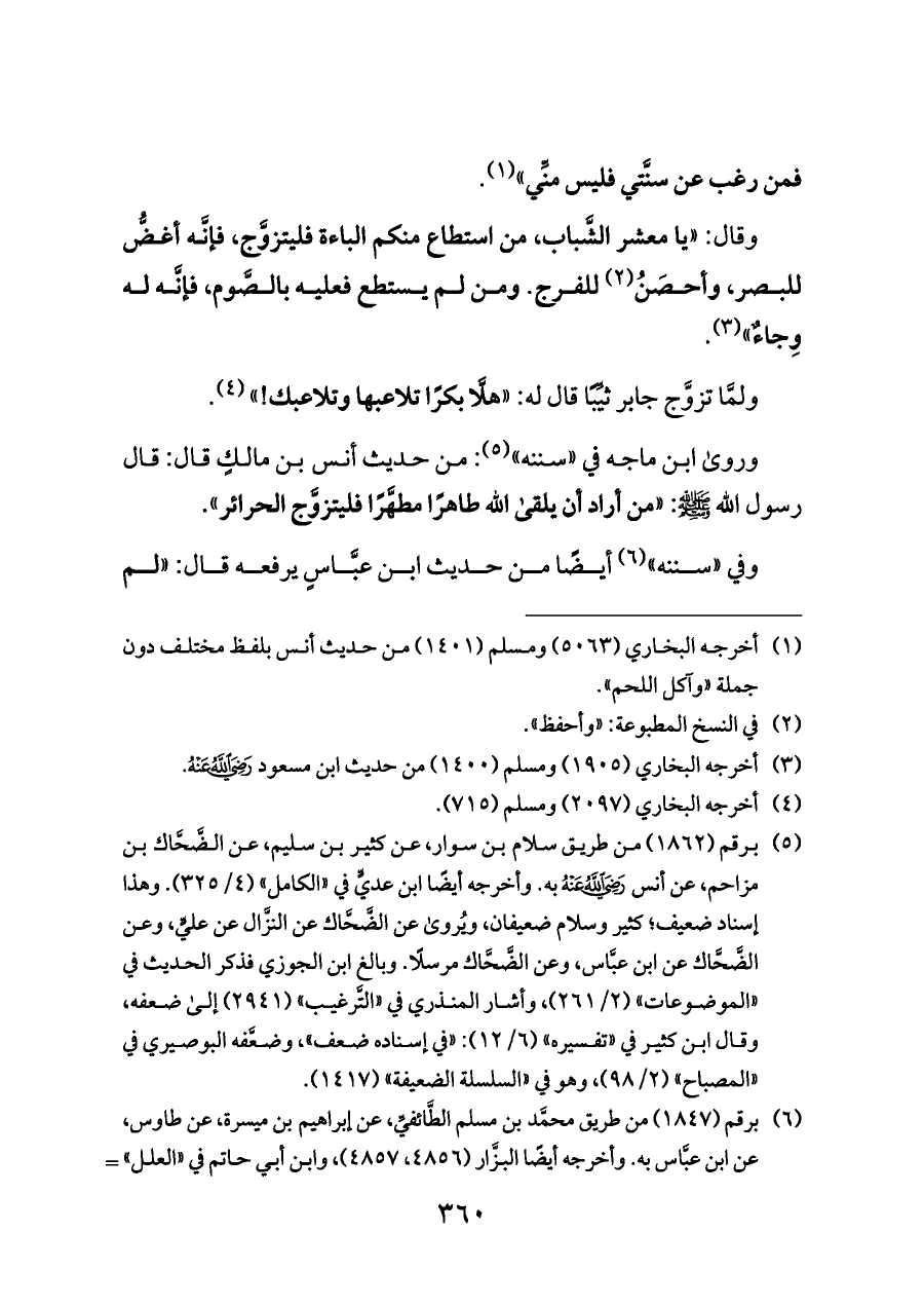 وروى ابن ماجه في «سننه» (¬٥): من حديث أنس بن مالكٍ قال: قال رسول الله - صلى الله عليه وسلم -: «من أراد أن يلقى الله طاهرًا مطهَّرًا فليتزوَّج الحرائر».
