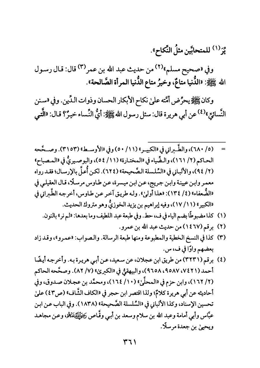 وفي «صحيح مسلم» (¬٢) من حديث عبد الله بن عمر (¬٣) قال: قال رسول الله - صلى الله عليه وسلم -: «الدُّنيا متاعٌ، وخيرُ متاع الدُّنيا المرأة الصَّالحة».